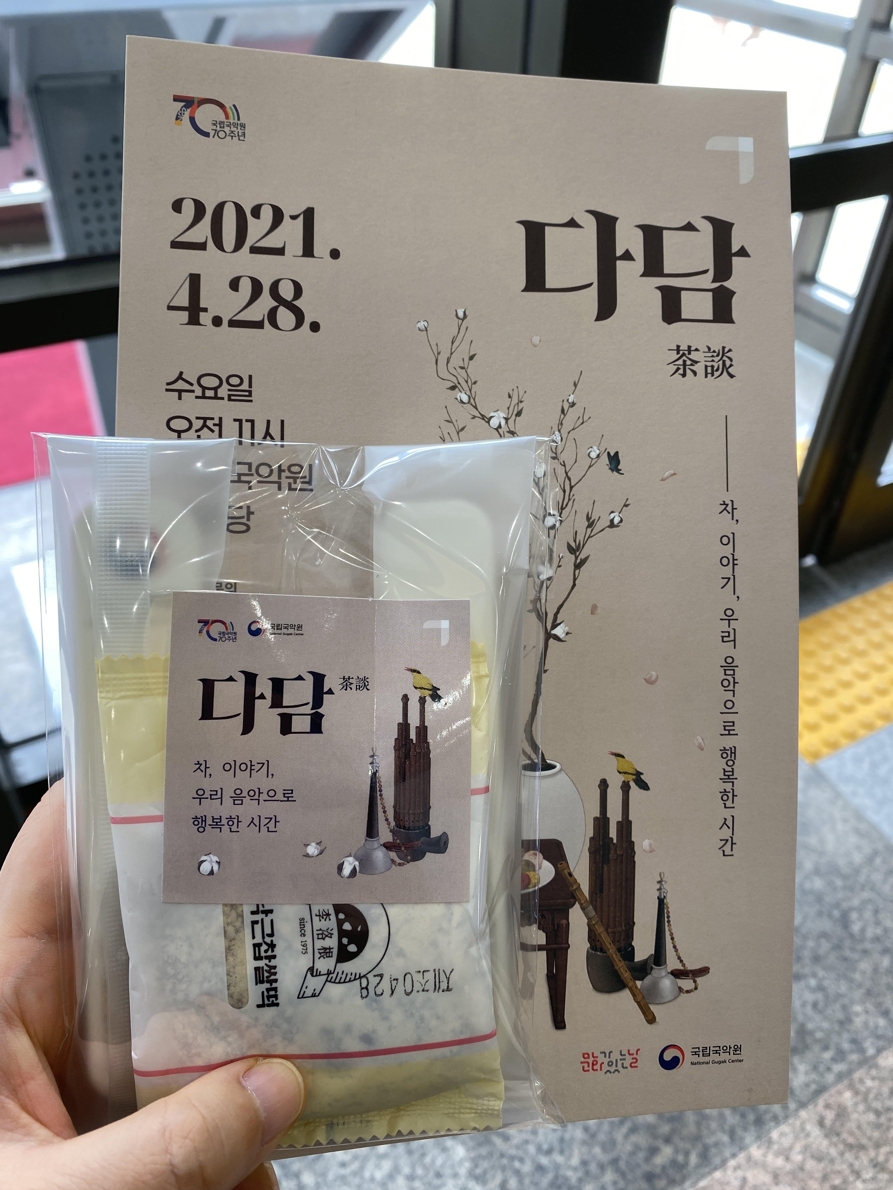 끝나고 나오니 이렇게 떡이랑 차까지 주고, 역시 국립국악원은 사랑이다.