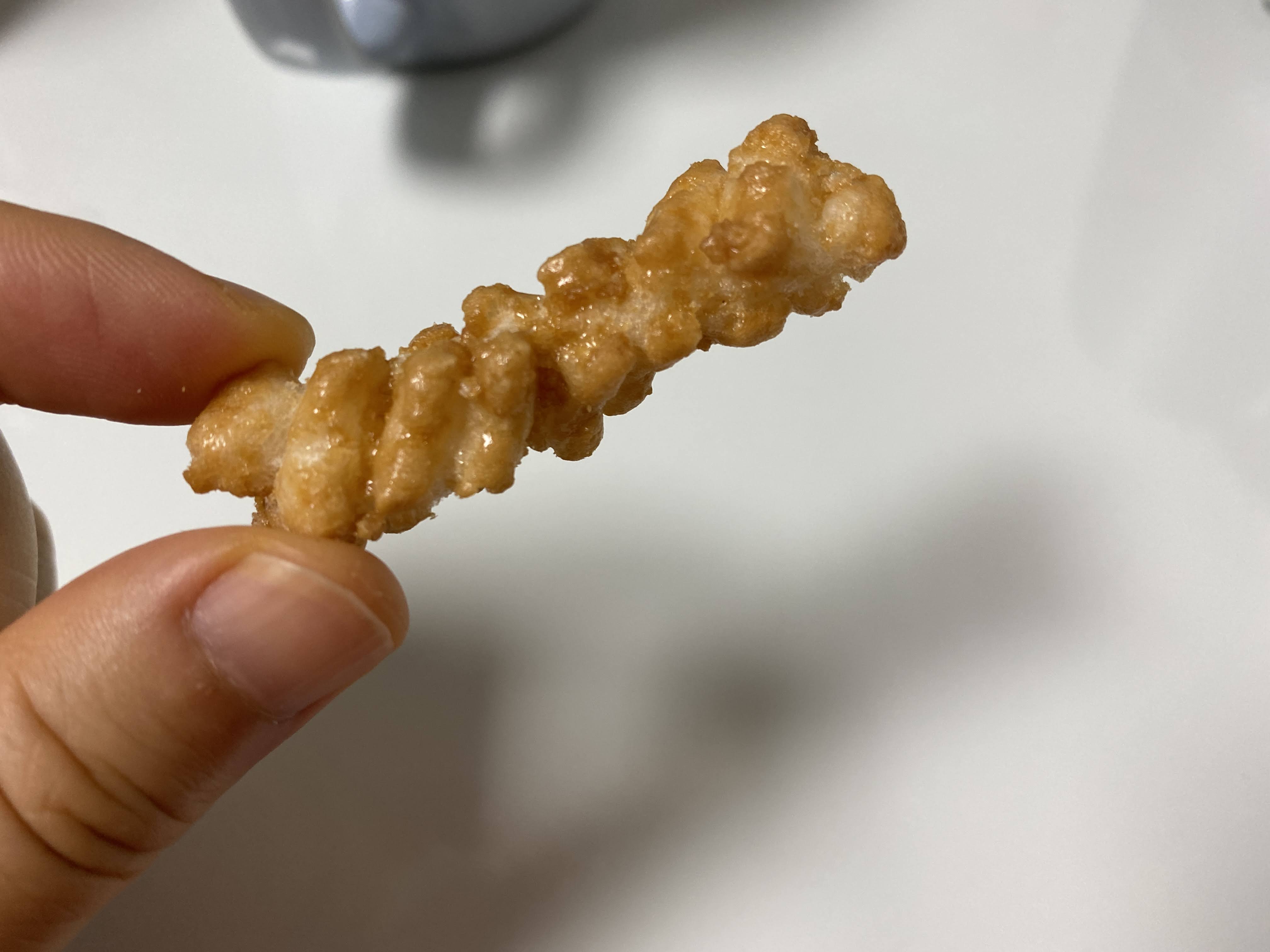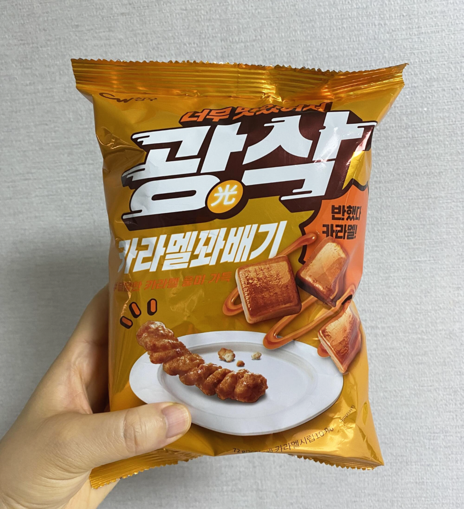 봉지 뜯자마자 카라멜 향이 확~ 풍기는 그 정도는 아니고, 적당히 난다. 만약 확 났으면 먹기도 전에 물렸을 텐데 다행이다. 꽈배기는 잘 튀겨서 아주 바삭바삭했다. 카라멜 맛은 아주 진하지 않고 겉에 살짝 휘도는 정도! 혀끝에 딱 좋을 만큼만 카라멜 맛이 난다.