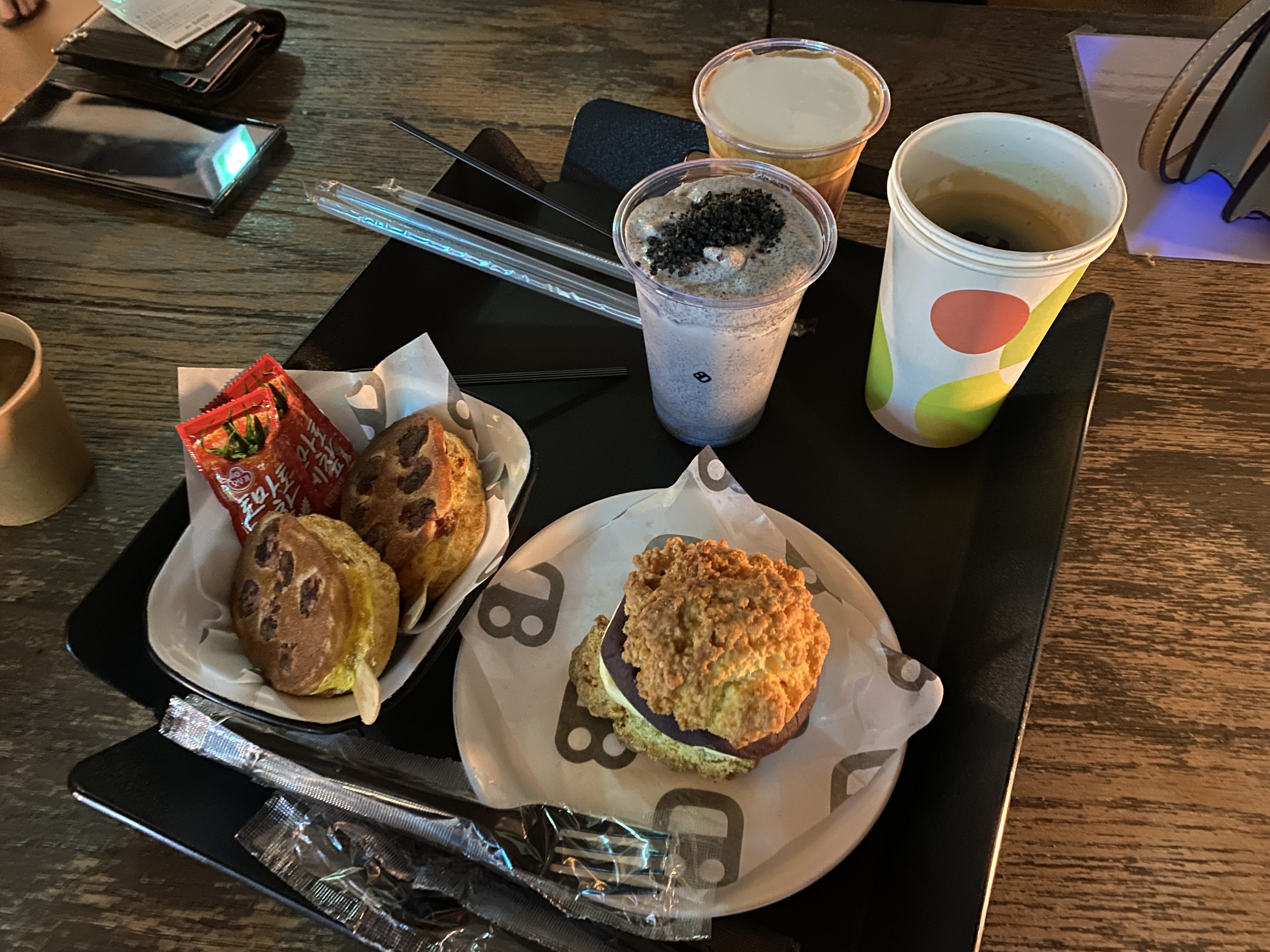 친구들도 앙버터 스콘과 소세지 계란빵을 주문. 음료는 흑임자 라떼와 아인슈페너를 시켰다.