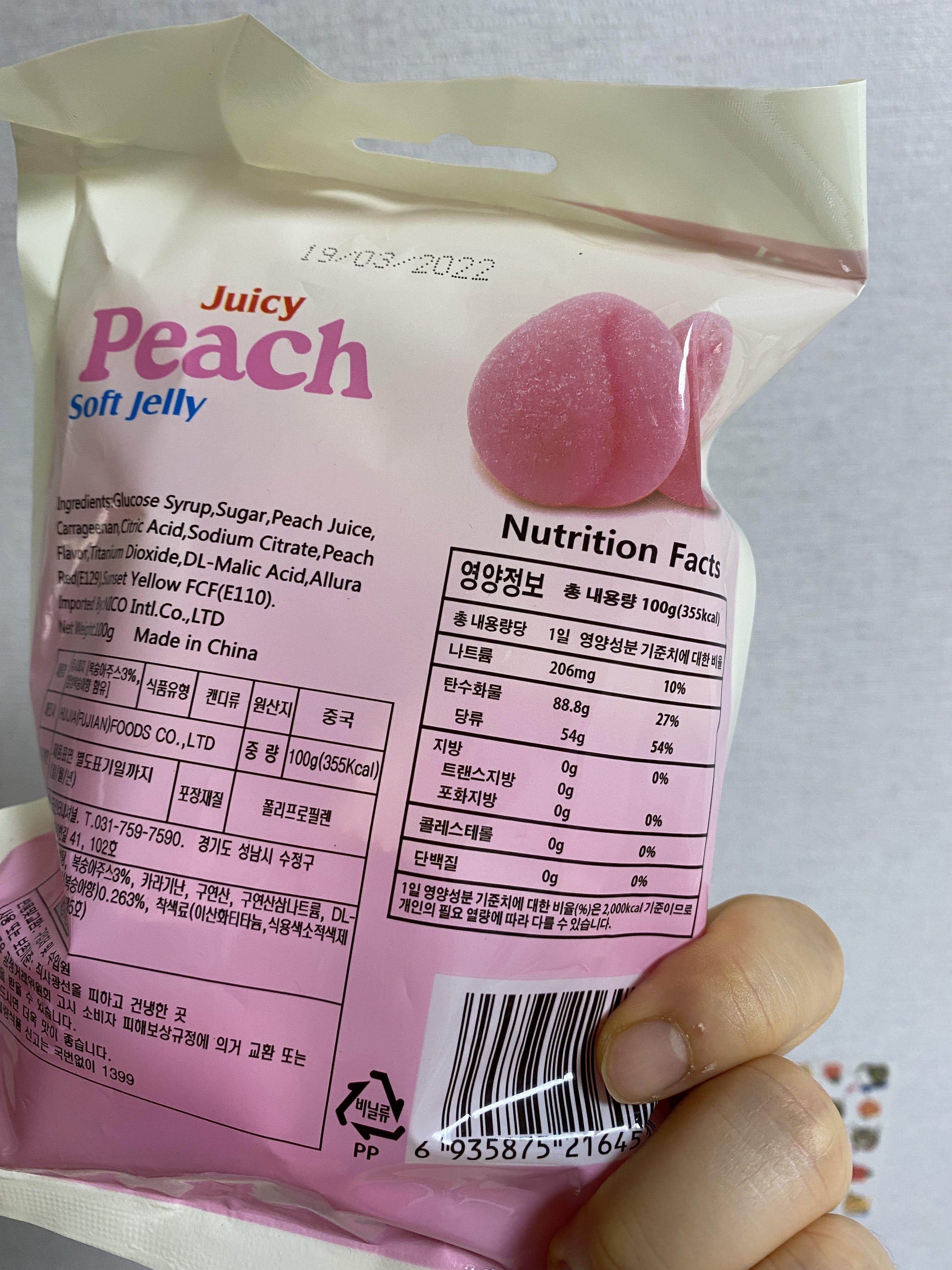 뒷면에 복숭아 모양 젤리. 이 회사는 재료의 모양을 그대로 젤리로 구현하는 걸 좋아하나 보다.
