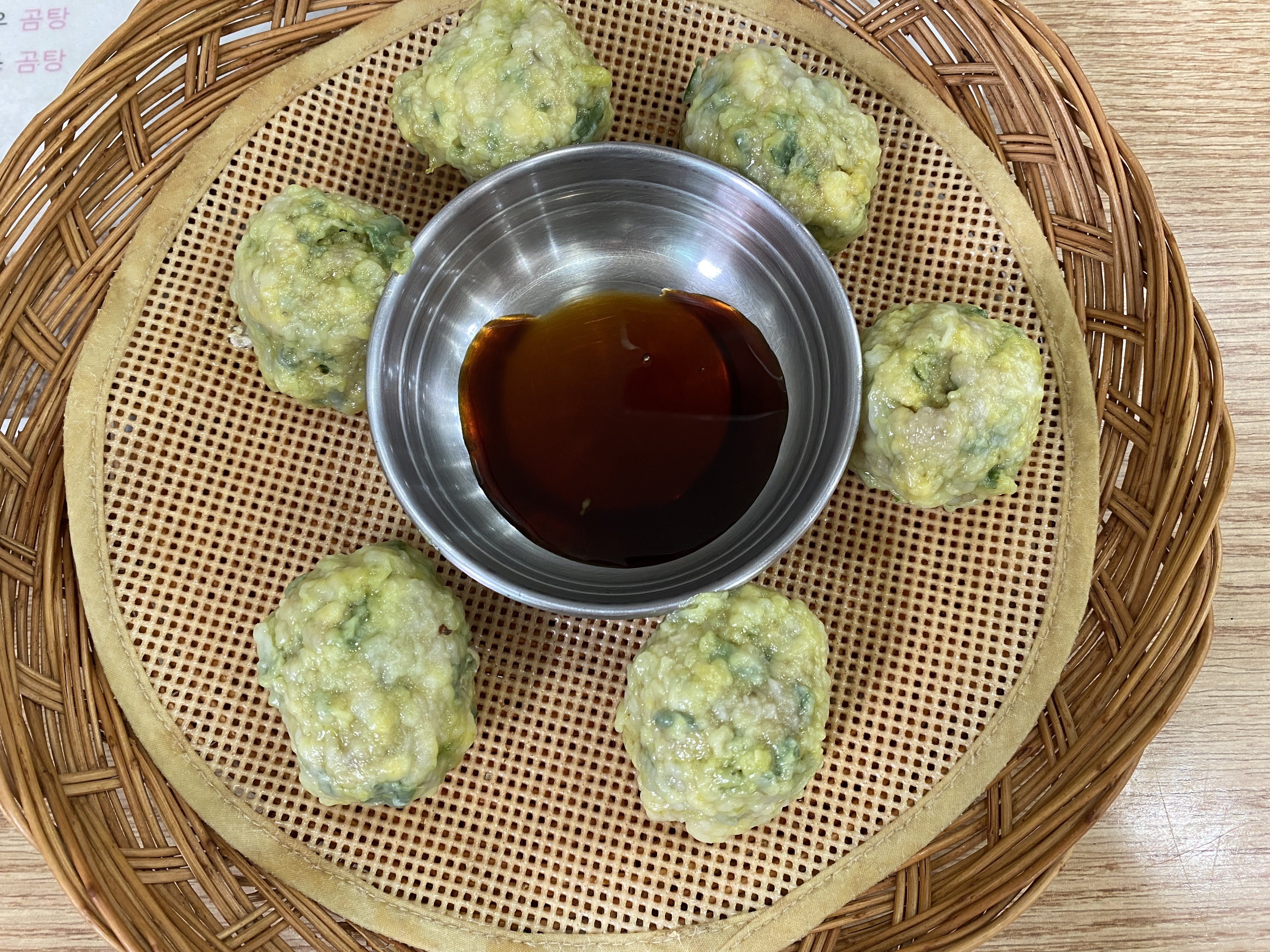 먼저 강황 완자 만두가 나왔다. 동글동글 오돌도돌한 만두다. 크지는 않지만, 이게 아마 여기서 파는 음식 중 가장 간이 강할 거다.