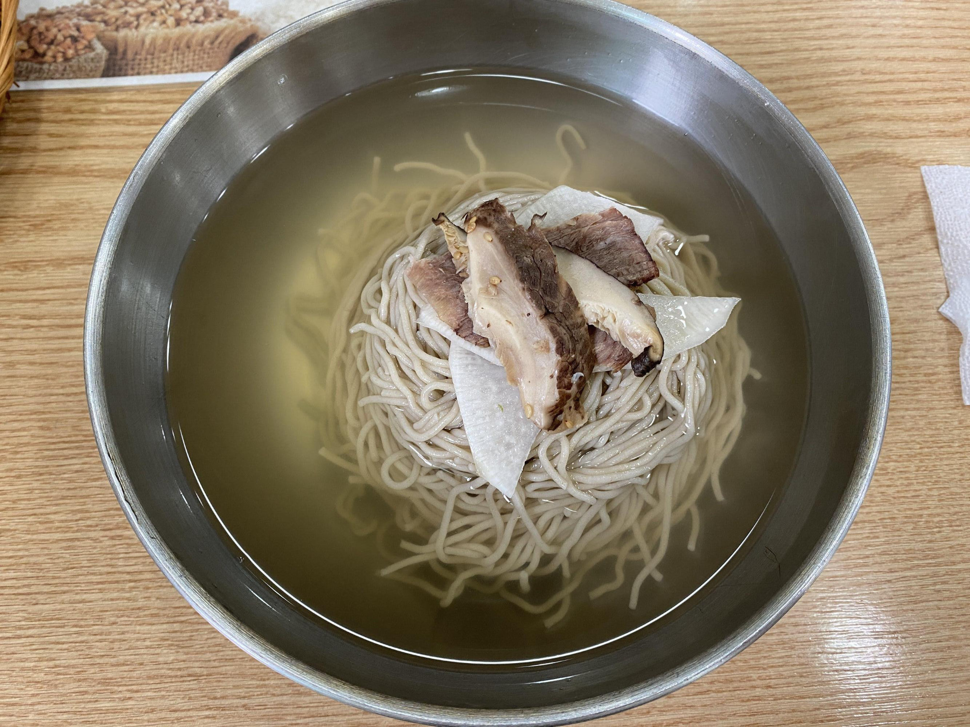 나는 미지근한 면과 강황 완자 만두를 주문했다. 이날 아주 찬 음식은 먹고 싶지 않아서 미지근한 면을 골랐다. 주문하고 자리에 앉아서 육수?를 먹는데 맛없다. 한 모금 마시고 뭔지 모를 맛이라서 그만뒀다.