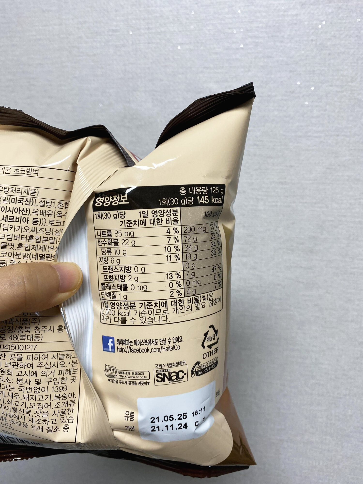 125그램을 조각조각 나누어 30그램당 영양 정보를 알려 주었다. 1그램당 4.8킬로칼로리 정도니까 한 봉지에 약 600킬로칼로리다. 훠우!!! 이렇게 칼로리가 높으면 맛이 기대되는데?!