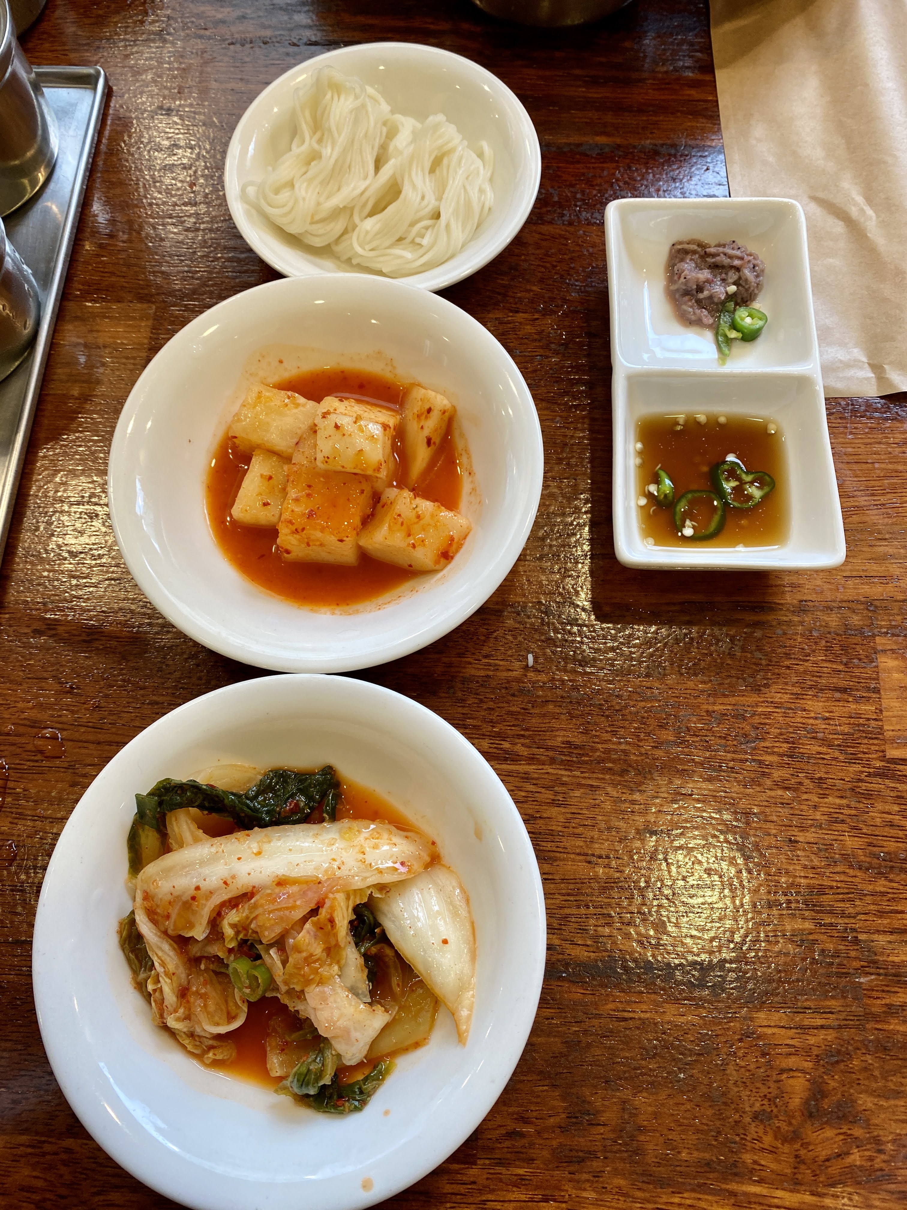 주문하고 차분하게 깔린 밑반찬. 겉절이랑 깍두기, 소면.