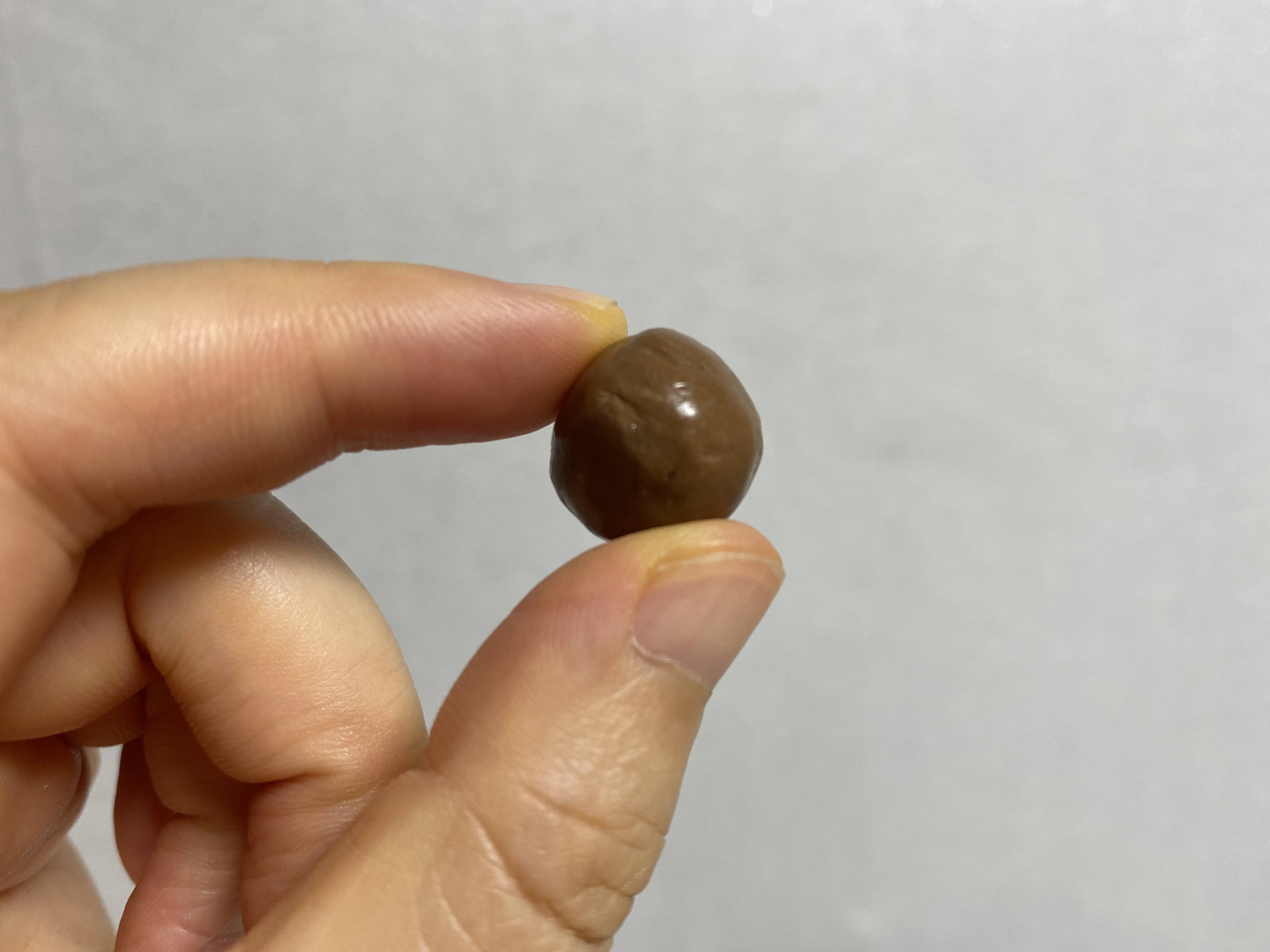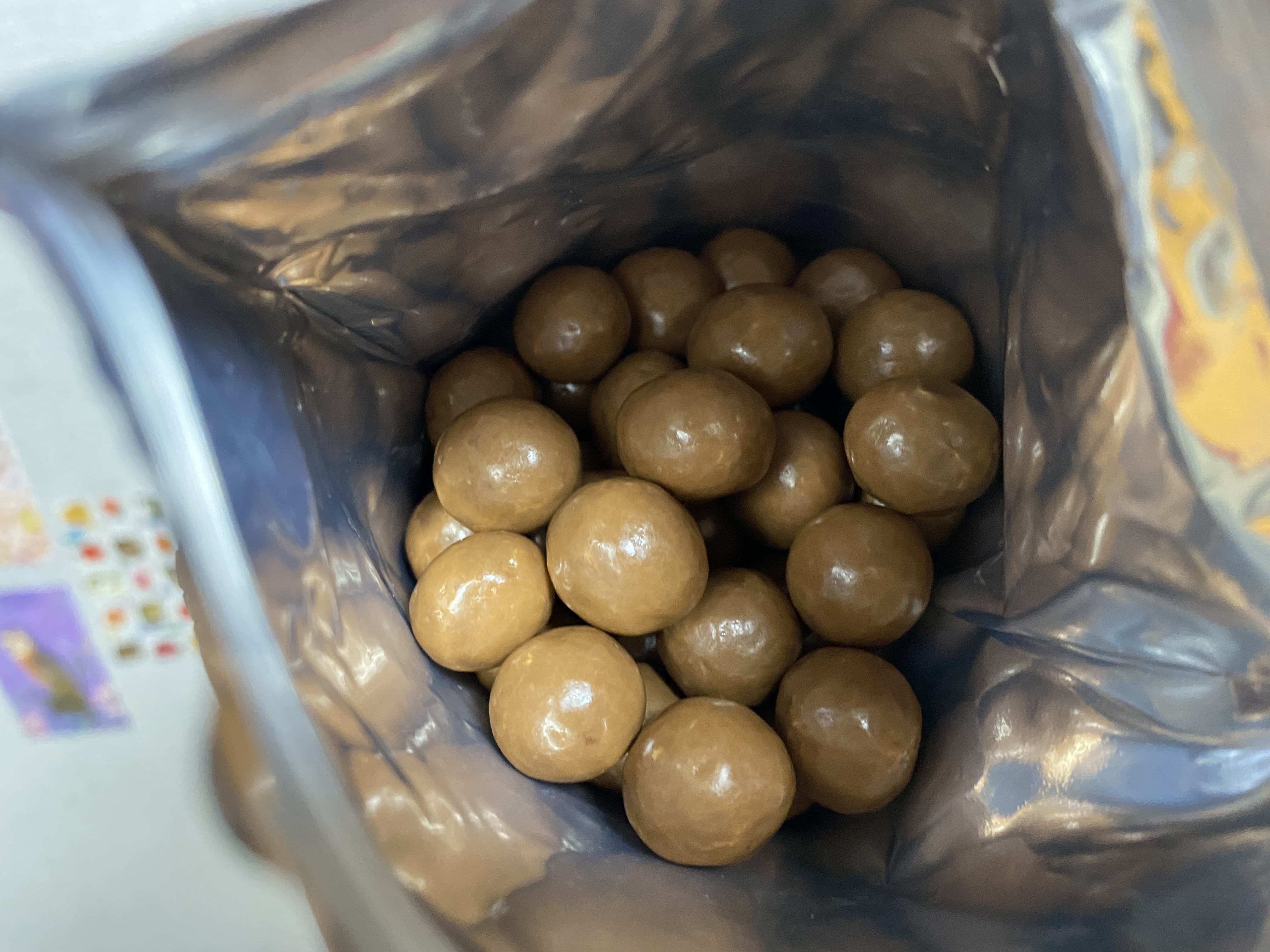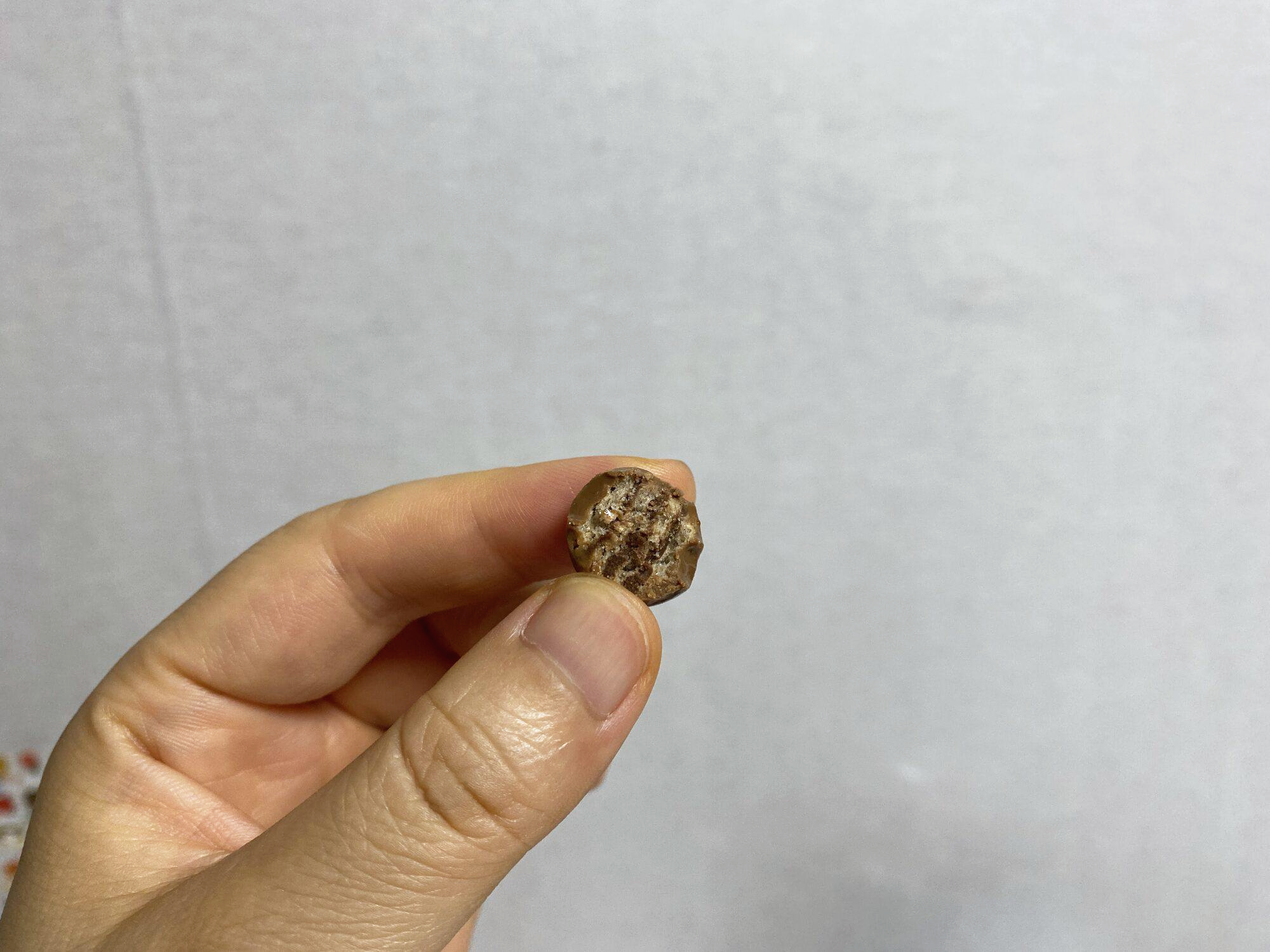 한참 유행했던 몰티저스보다 약간 더 작은 크기. 그리고 살짝 무르다. 녹아서 그런 건지 잘 모르겠지만 딱딱한 초코볼 스타일은 아니었다.
