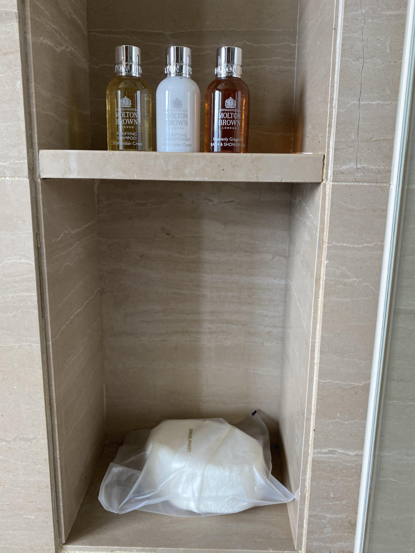 어메티니는 몰튼브라운. 샤워 스펀지도 주는 게 좀 독특했다. 바디로션은 밖 세면대 쪽에 있었고 칫솔이랑 면봉 등은 서랍을 열면 나온다. 안 그래도 칫솔 챙기는 걸 깜빡해서 사러 나가야 하나 싶었는데, 부드러운 미세모 칫솔을 제공해 줘서 기뻤다.