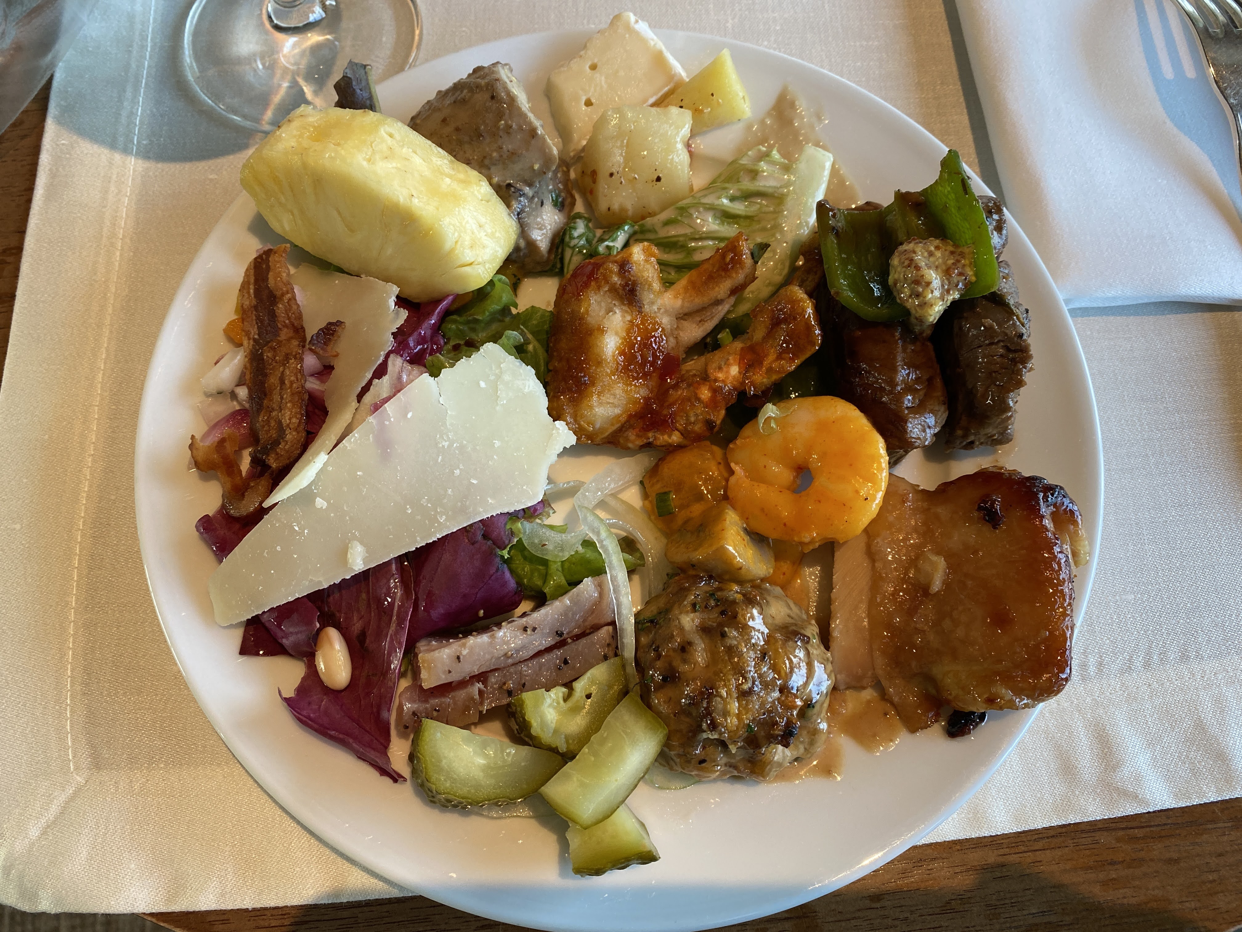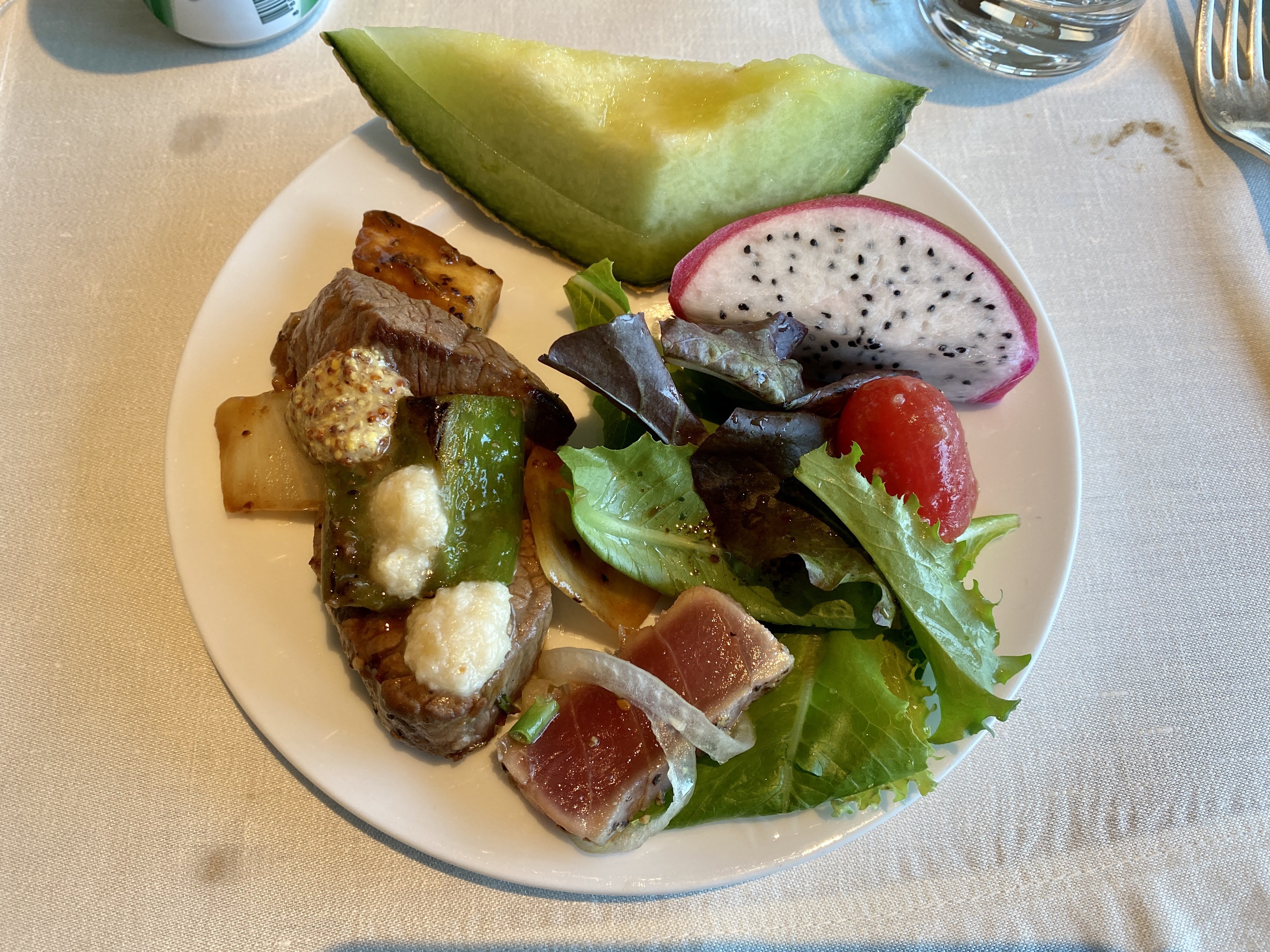 저녁 음식은 치즈랑 빵, 따뜻한 음식 종류, 과일과 케이크도 있었다. 가장 맛나게 먹은 건 참치 타다끼랑 찹스테이크.