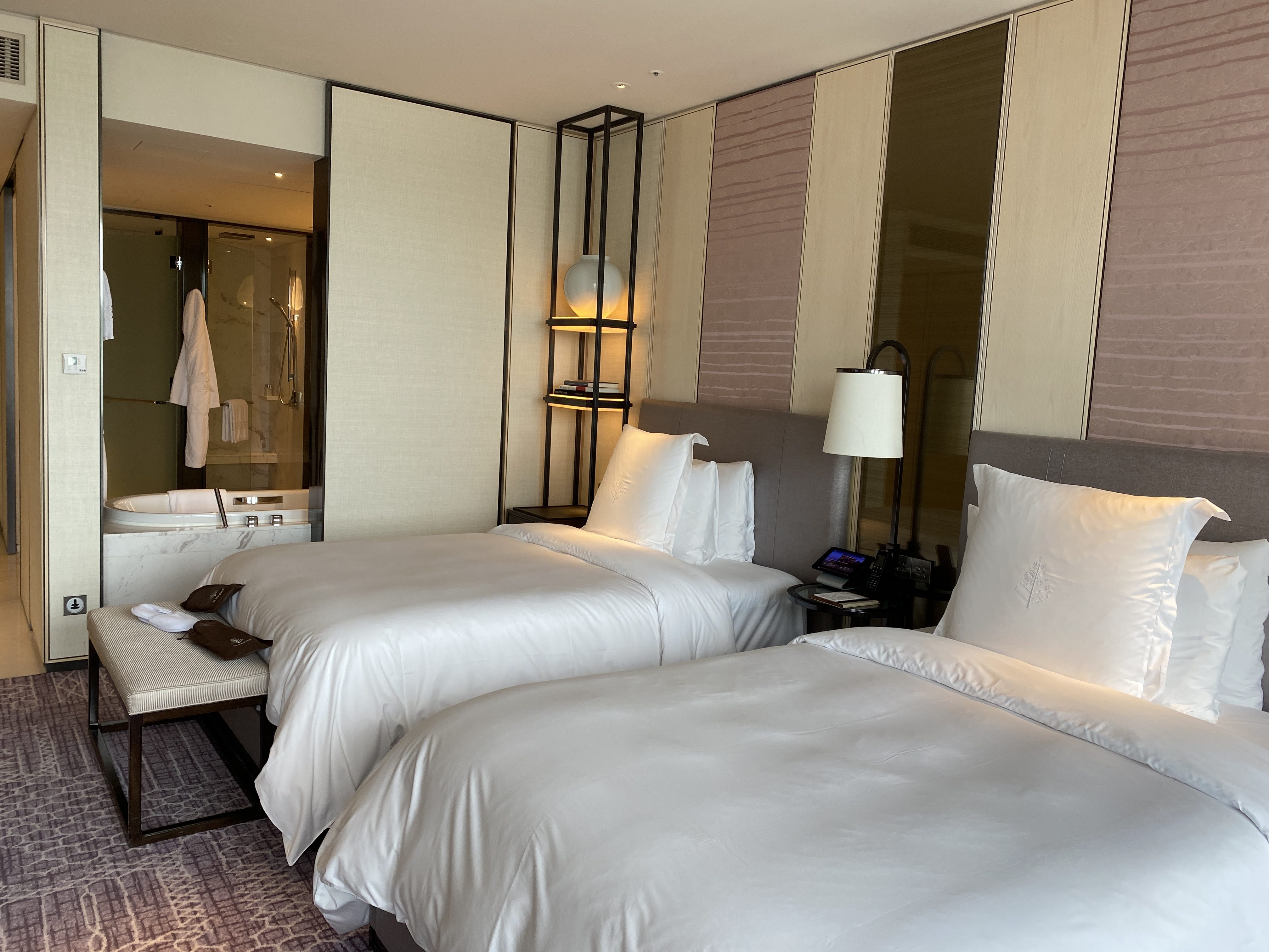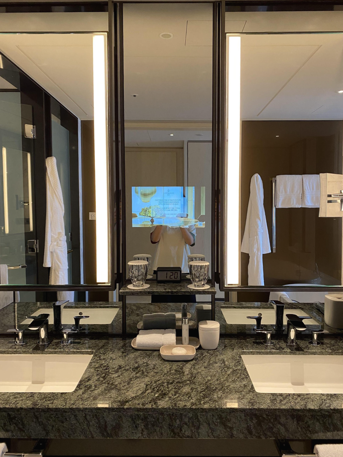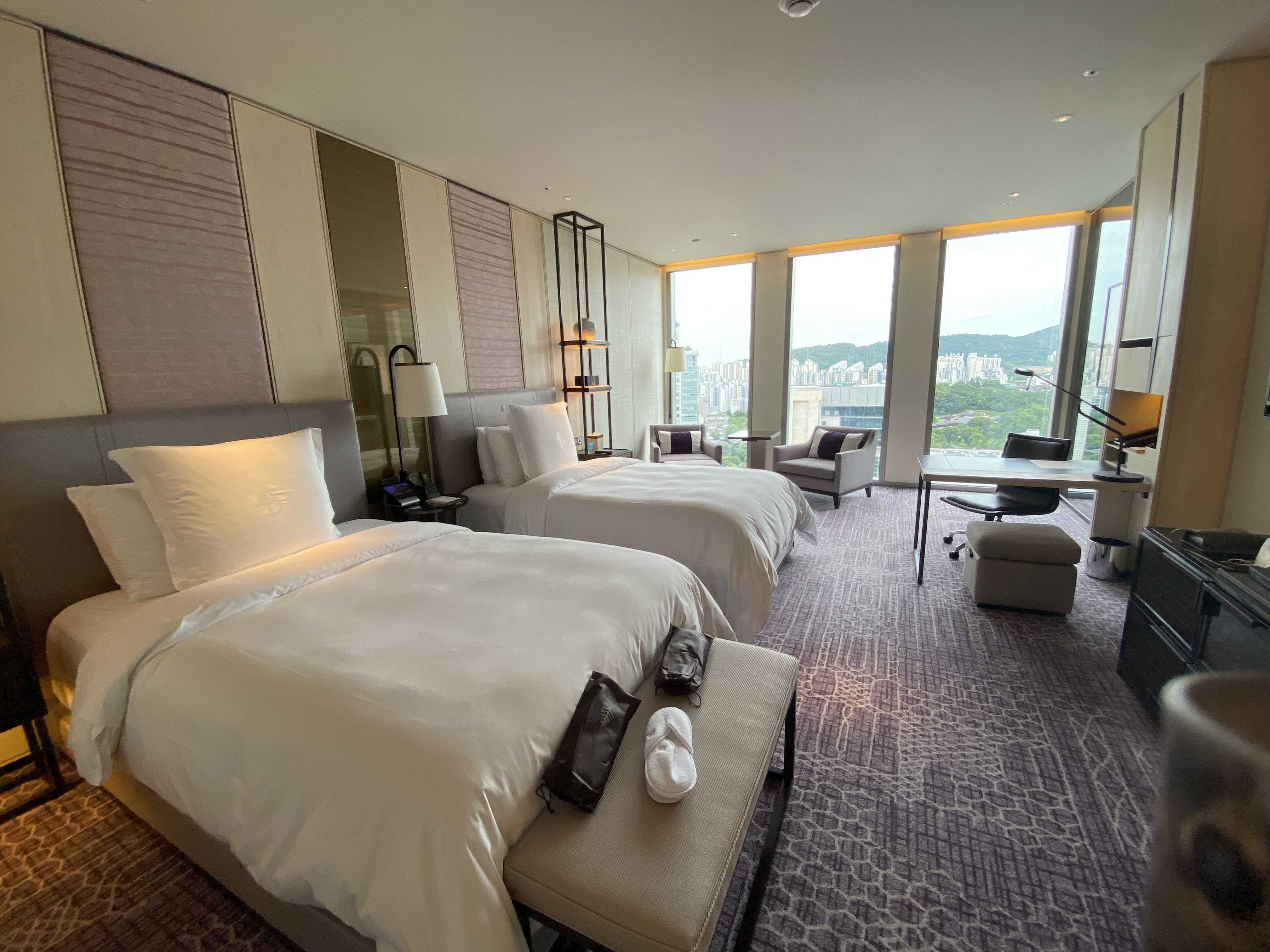 방도 신라호텔보다 좀 더 현대적인 느낌이라 좋았다. 전면 유리창이라서 탁 트인 느낌이고 뭔가 장식물도 많아서 더 신경 썼다는 기분이 들었다.