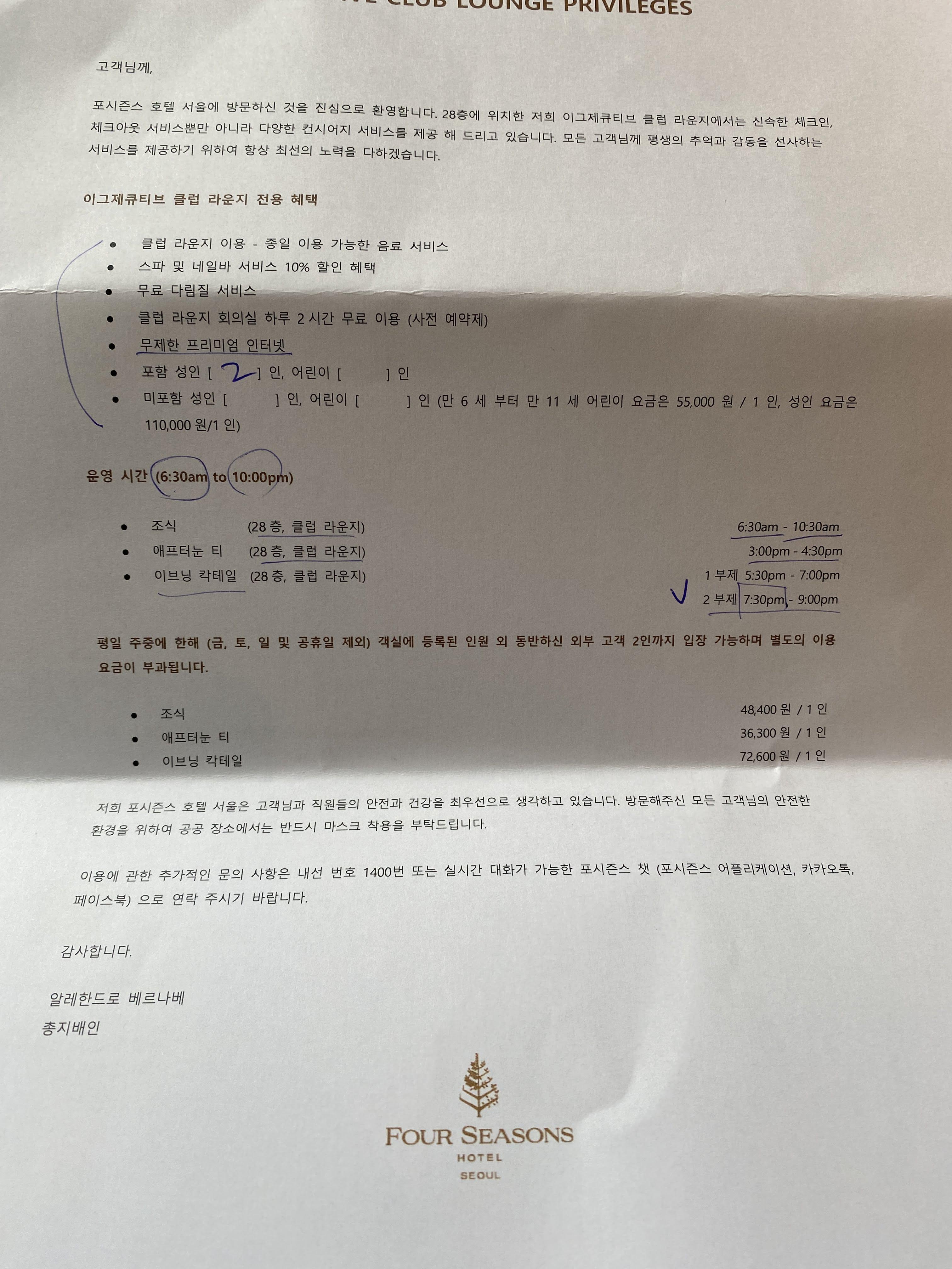 포시즌스의 이그제큐티브 라운지 운영 시간은 이렇다.