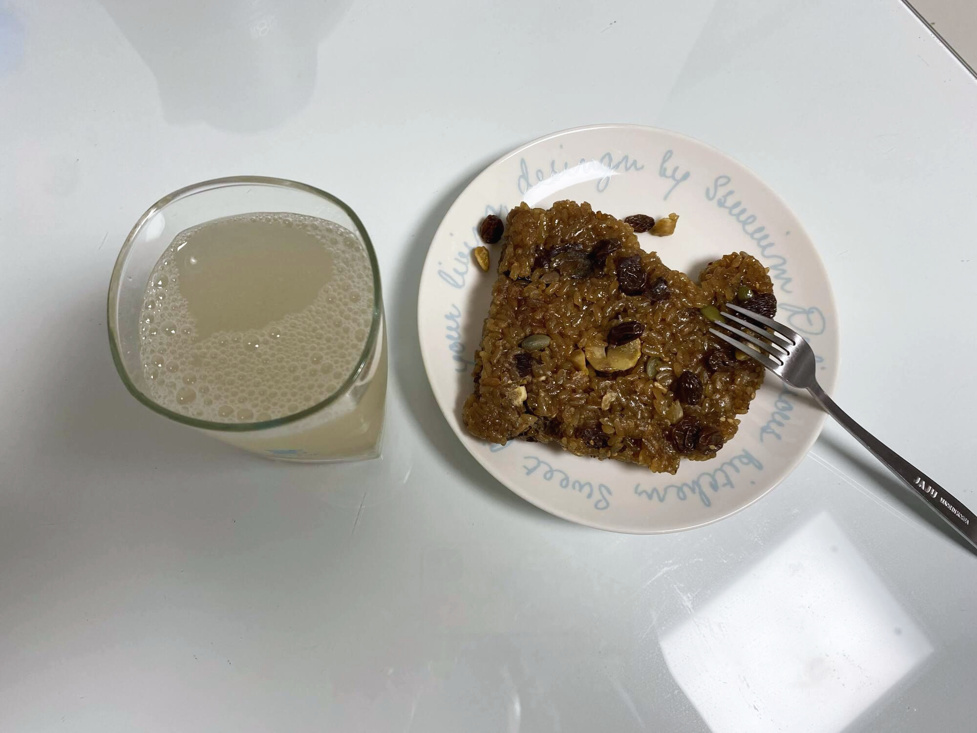 전통 음료니까 전통 음식과 함께. 엄마가 만들어 준 약식을 꺼냈다. 다른 말이지만, 우리 엄마 약식 엄청 맛있다. 재료도 많이 넣으셔서 한입마다 씹히는 것도 많고, 찰기도 뛰어나서 쫀득하다. 난 파는 약식은 안 먹는다. 엄마 약식이 최고.