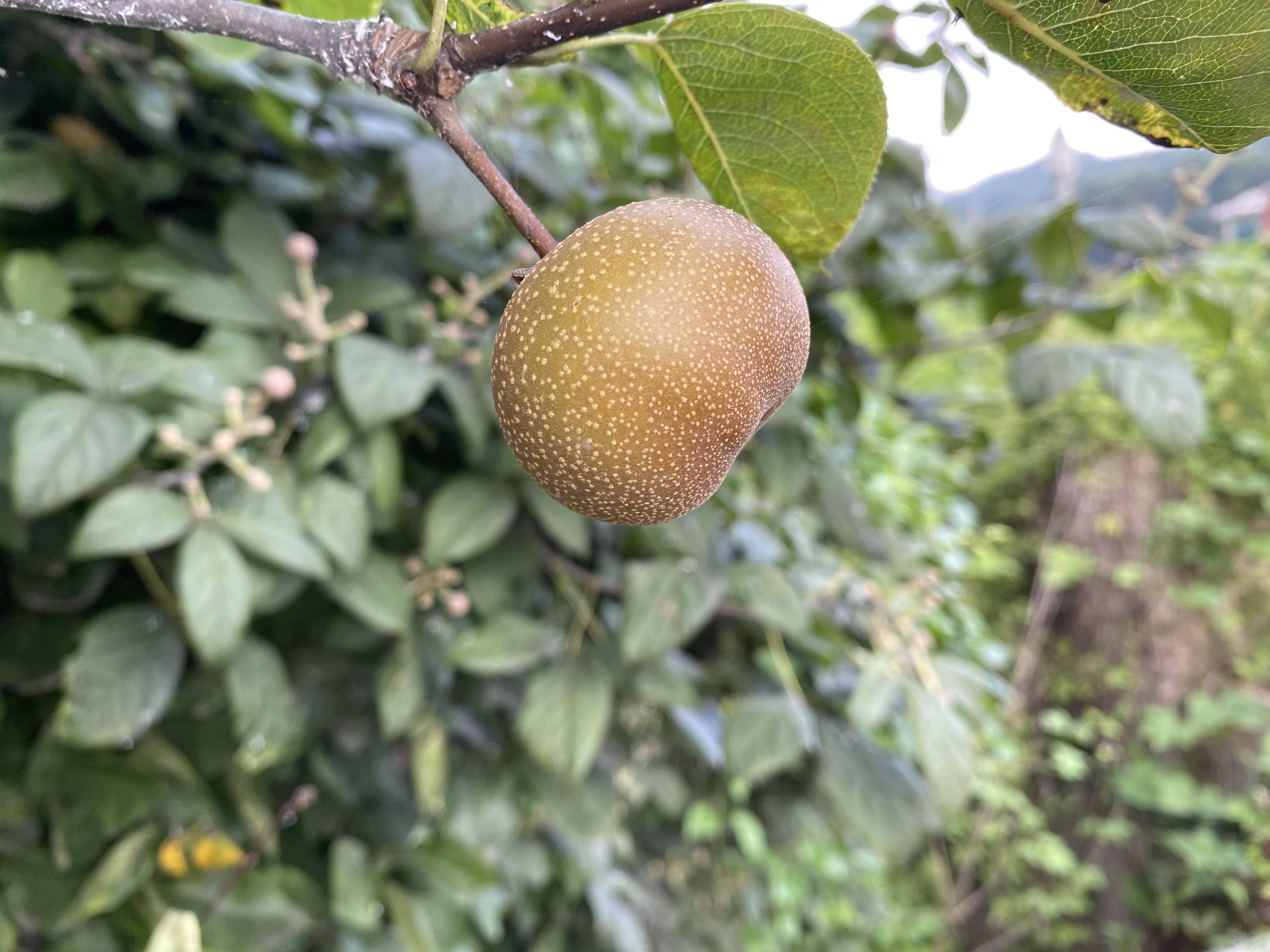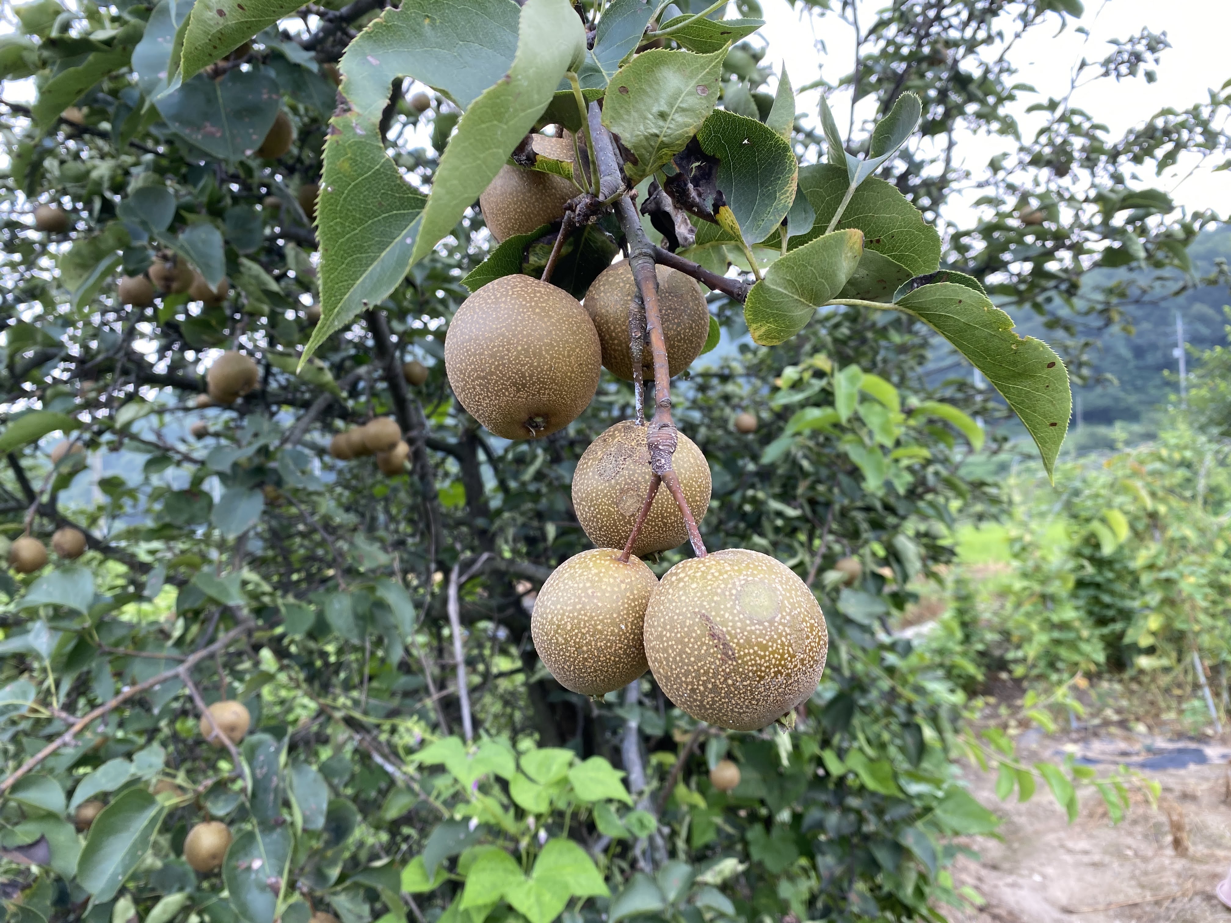 이건 배나무다. 약도 안 주고 그냥 방치하는 나무라서 꾀죄죄한데, 그래도 열매는 많이 달렸다.