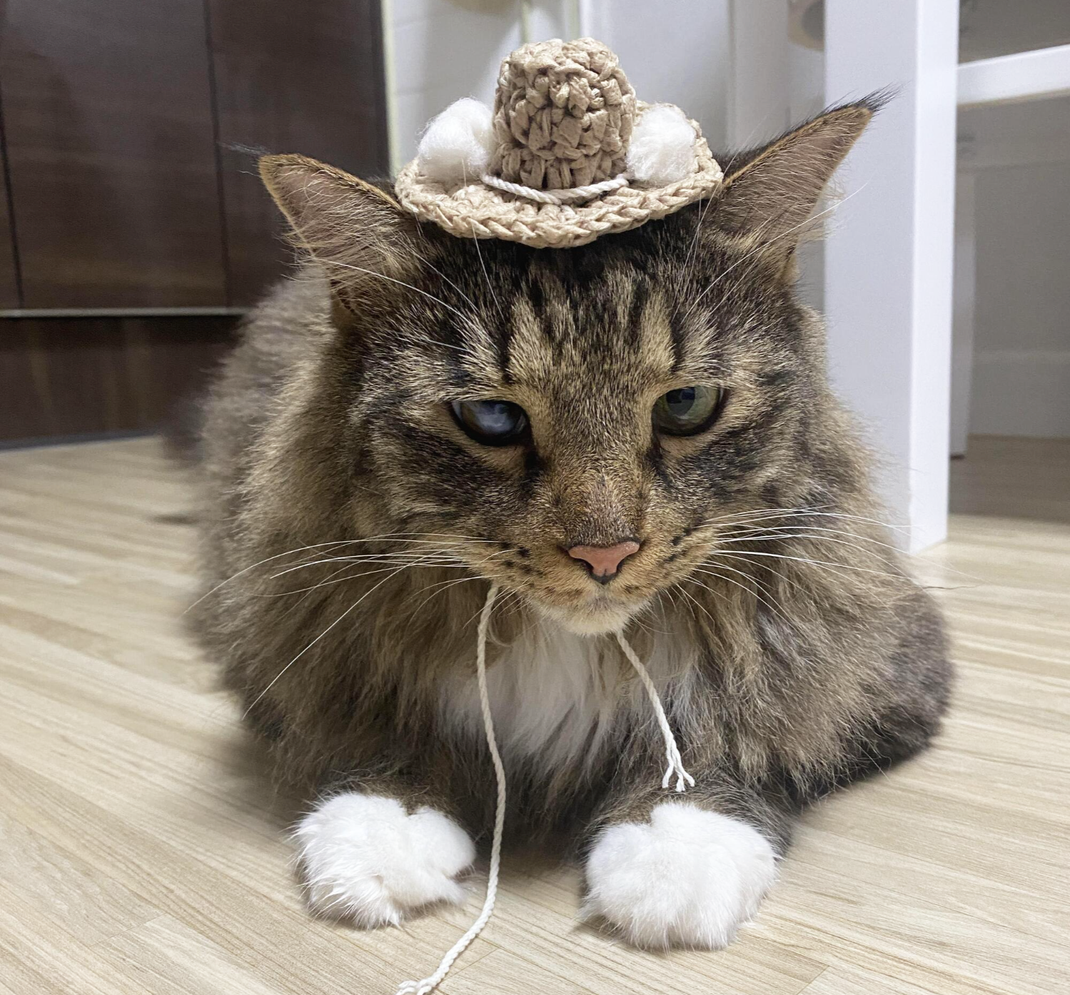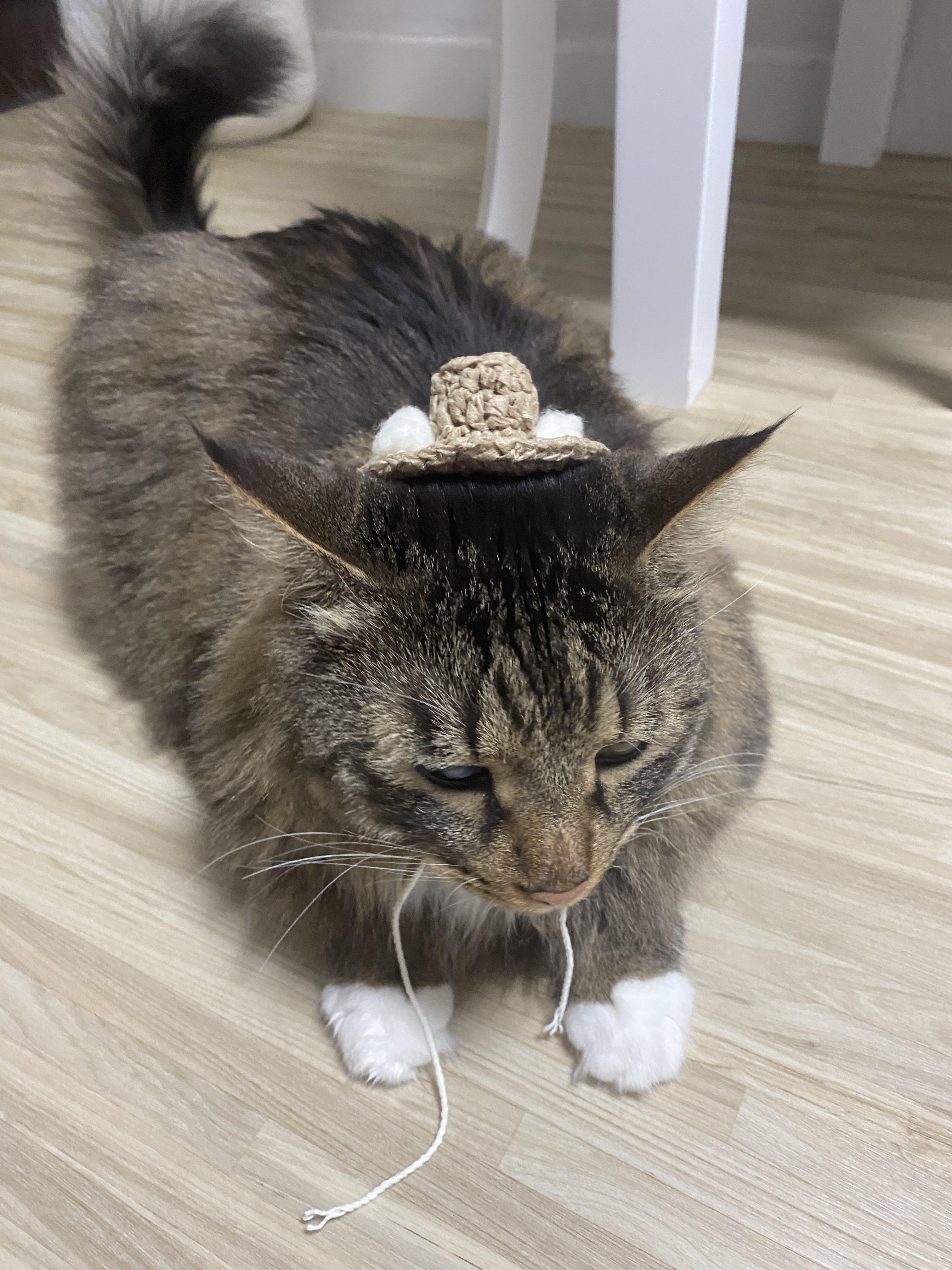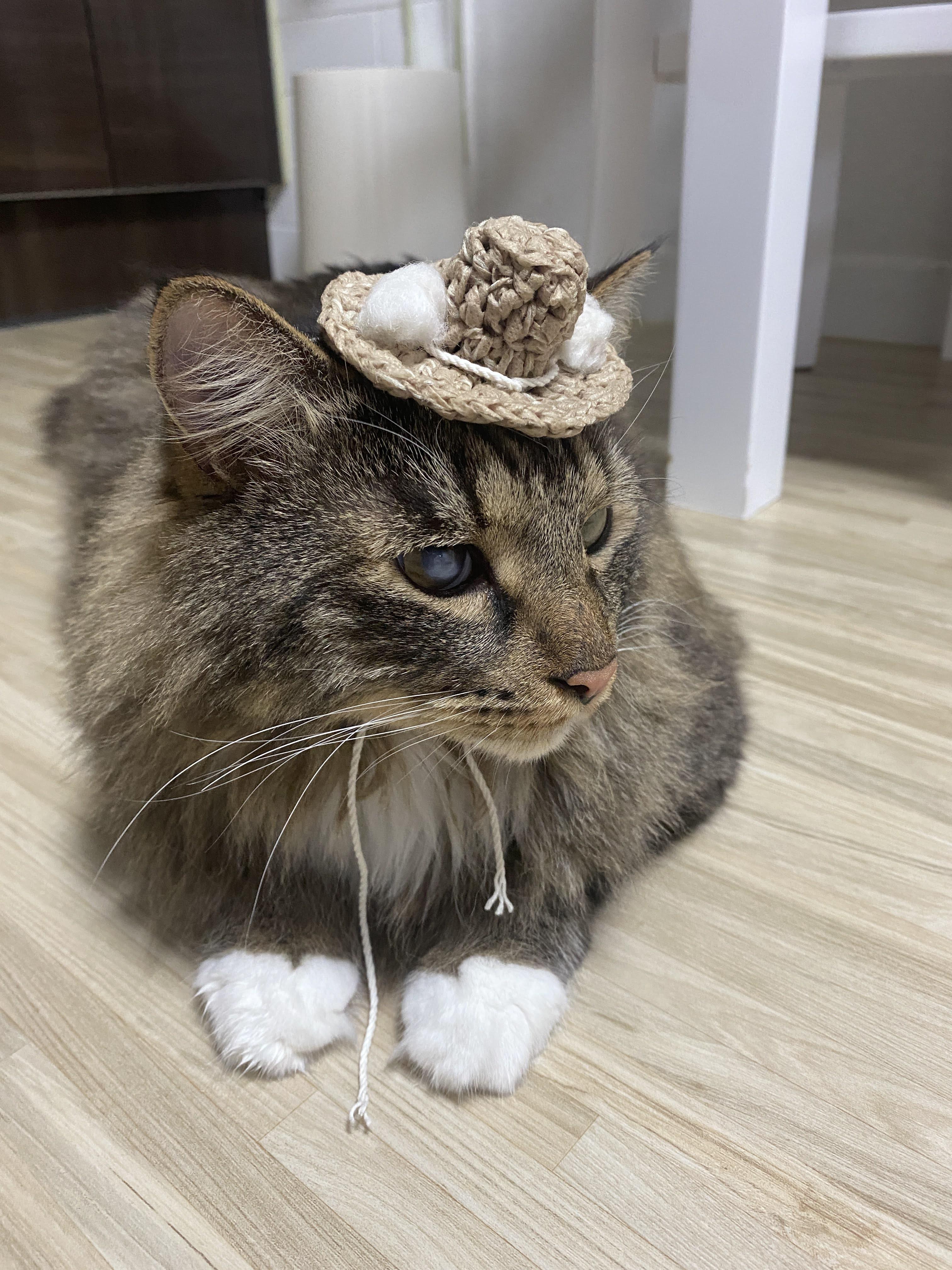크기는 대충 고양이 머리통에 얹어 가면서 만들었는데, 일부러 귀를 안 가리도록 작게 만들었다. 예전에 귀를 빼낼 수 있는 디자인으로 모자를 만든 적이 있었는데, 그래도 고양이가 엄청 불쾌해했기 때문이다.