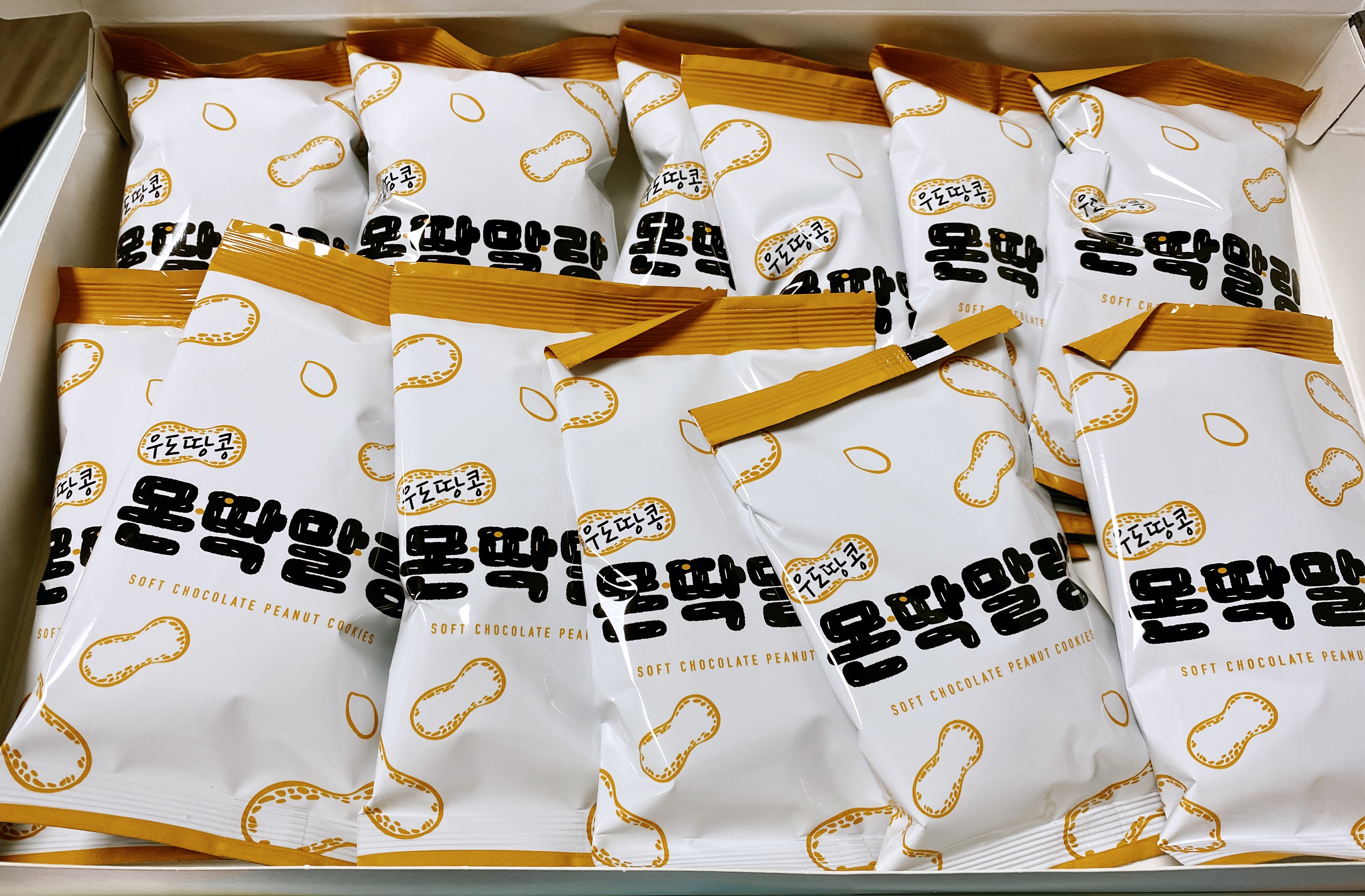 하얀 개별 포장 봉지에 귀여운 서체들.