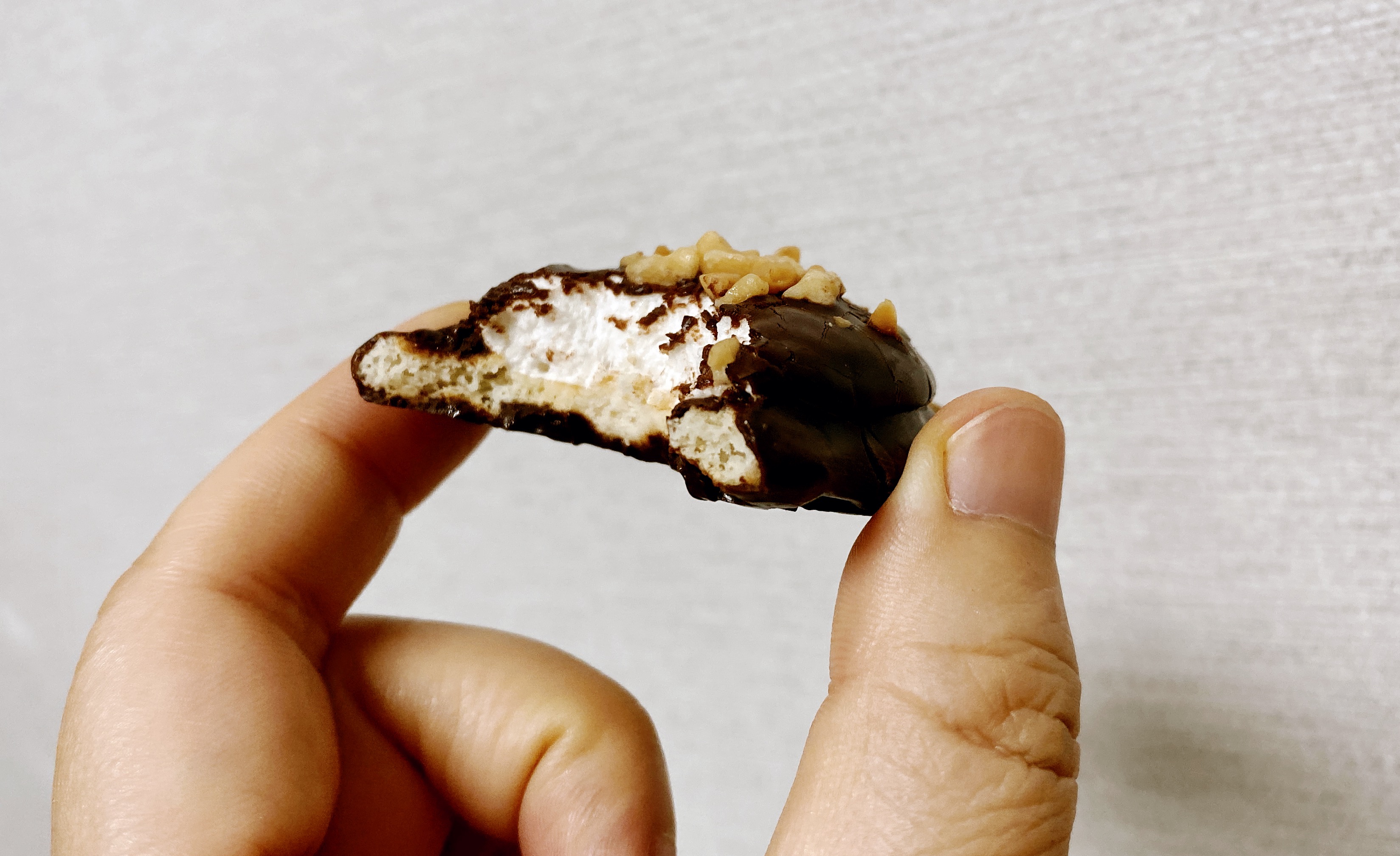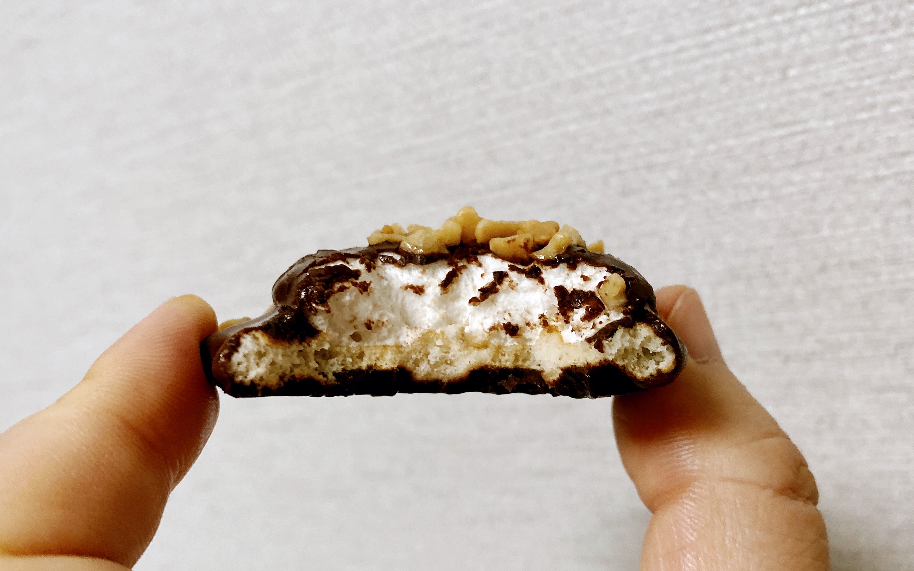 바삭한 과자 위에 몽글한 마쉬멜로우가 얹혀 있고, 그 겉은 초코가 꼼꼼히 싸악 감싼 뒤 고소한 땅콩이 마무리한다.