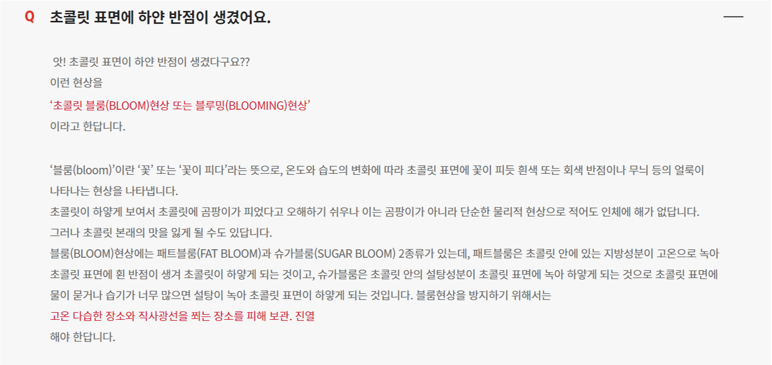 나중에 보니까 롯데제과 홈페이지에도 설명이 있었는데, 유통 과정 중에 온도 관리가 잘못되면 생기는 현상으로 당분이나 지방이 바깥으로 분리되어 나오는 현상이라고 한다.
