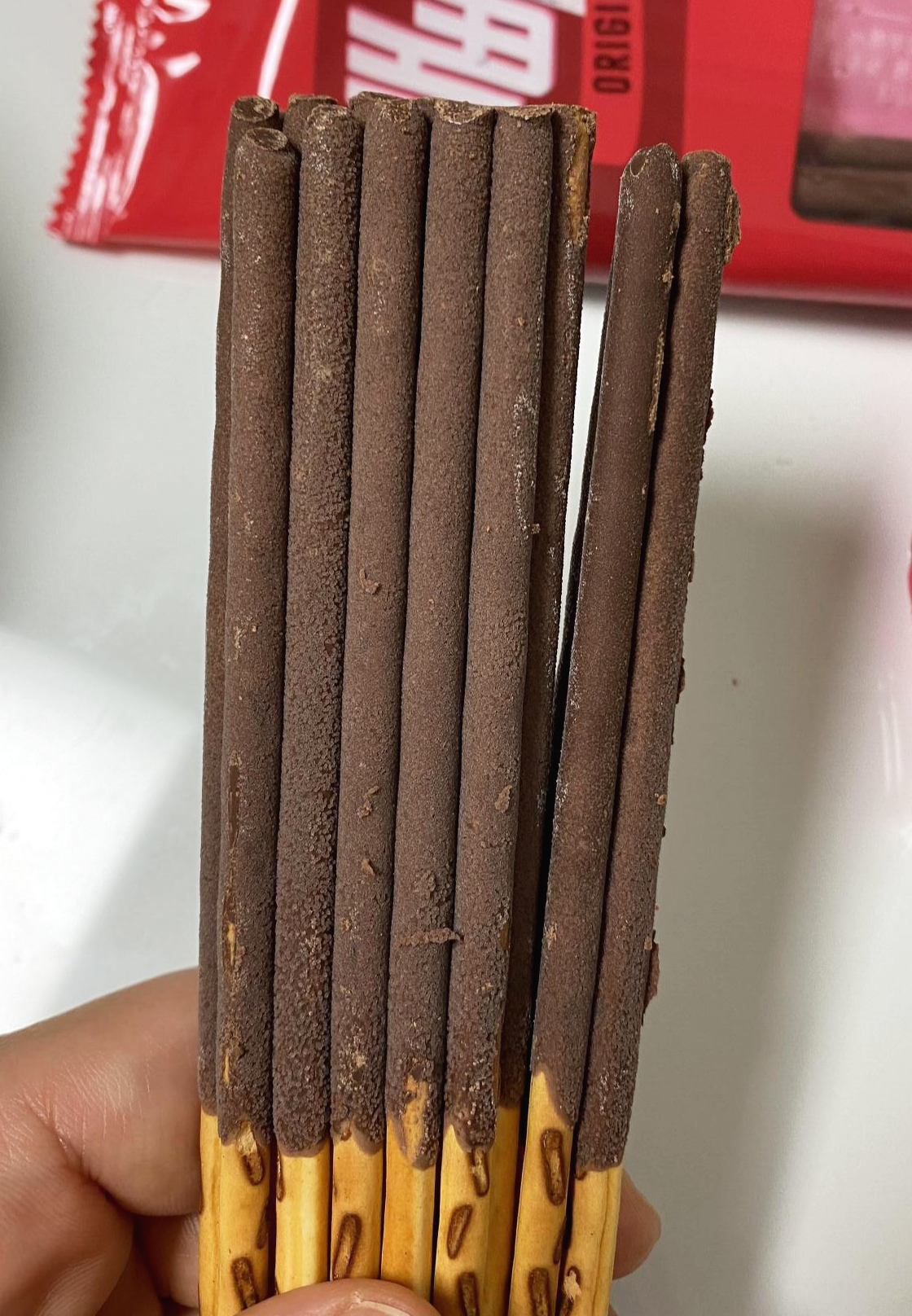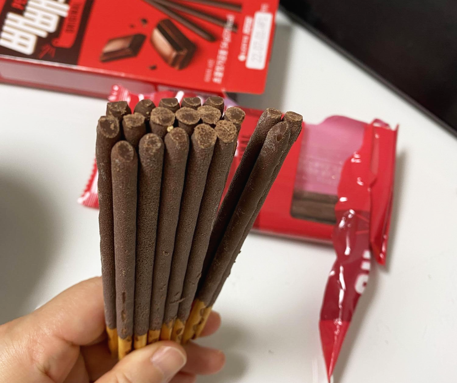 빼빼로의 반질반질해야 할 초콜릿 표면이 약간 하얗게 변해 있고, 광택도 잃었다.