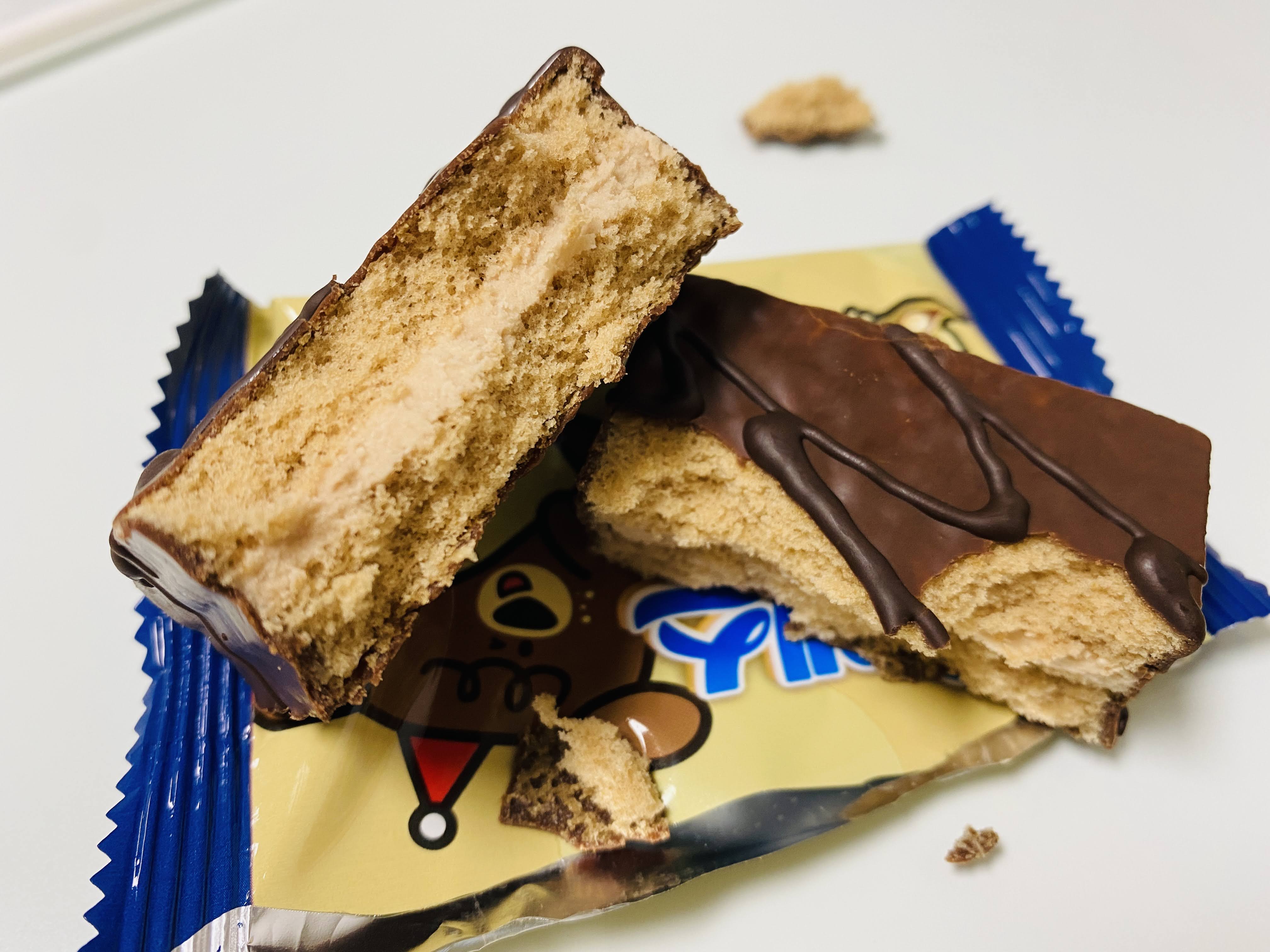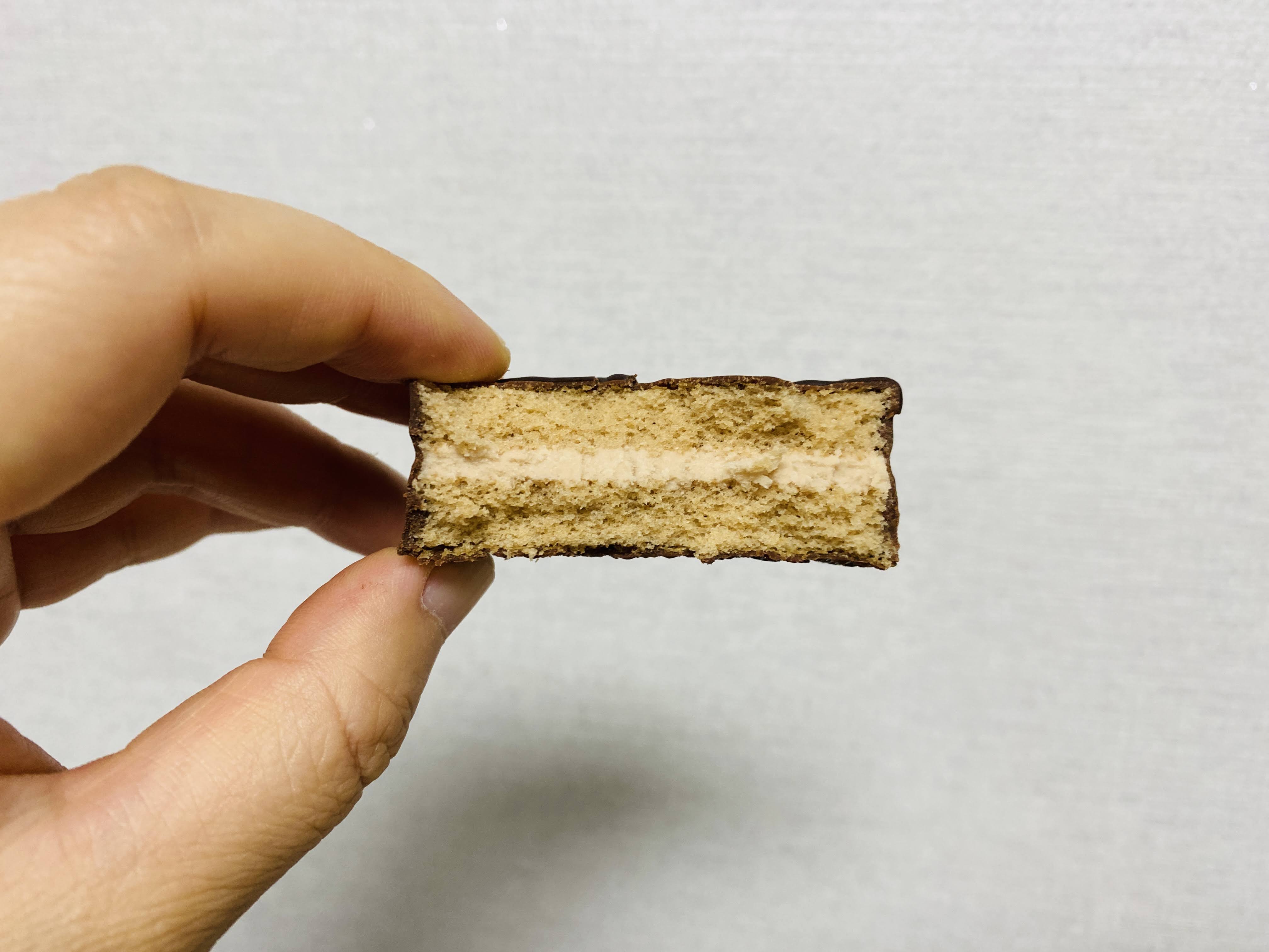 하지만 반을 쪼개면 약간 노르스름한 시트와 그 사이에 자리 잡은 베이지색 크림이 보인다.