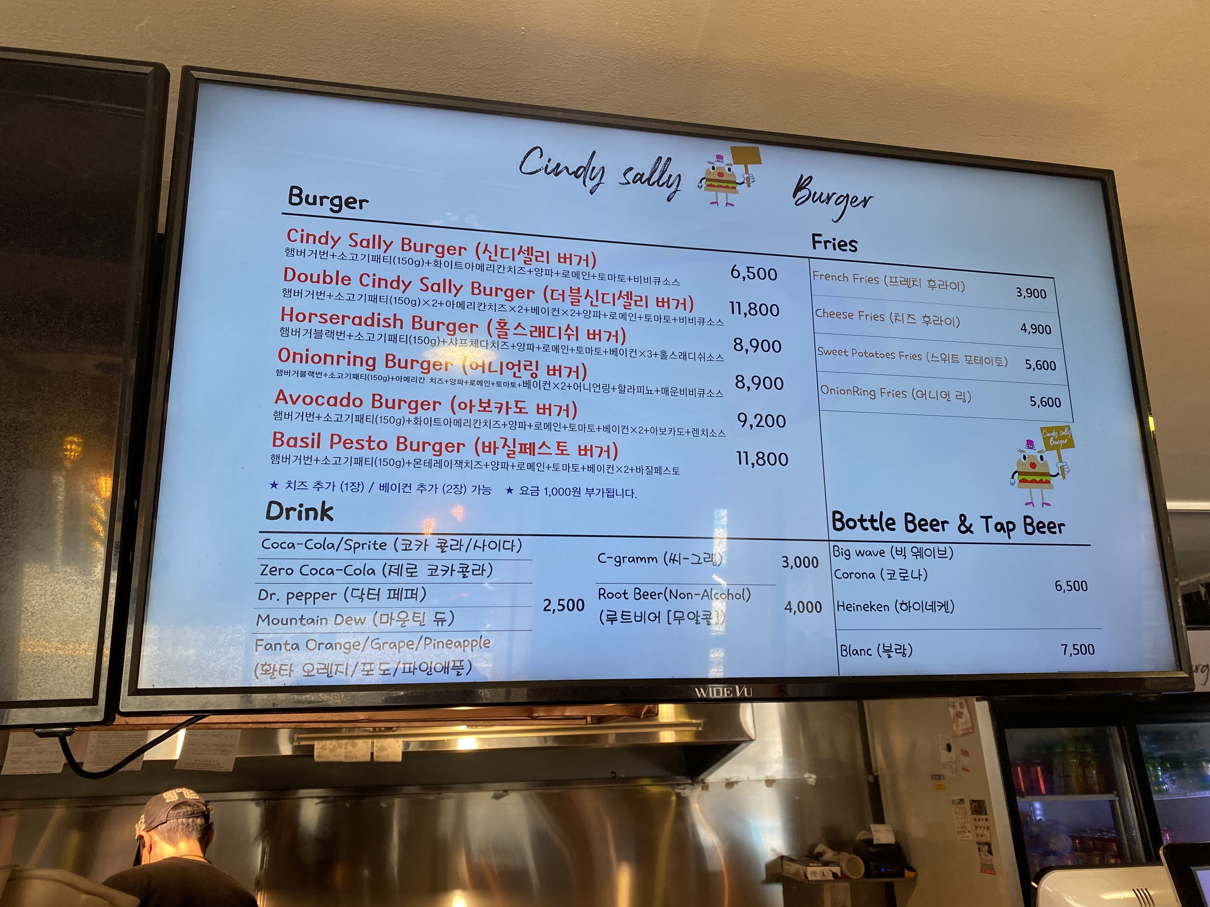 키오스크 주문이라서 슬슬 다가가서 일단 가장 기본인 신디 샐리 버거를 주문하고 후렌치 후라이랑 제로 콜라를 함께 결제했다.