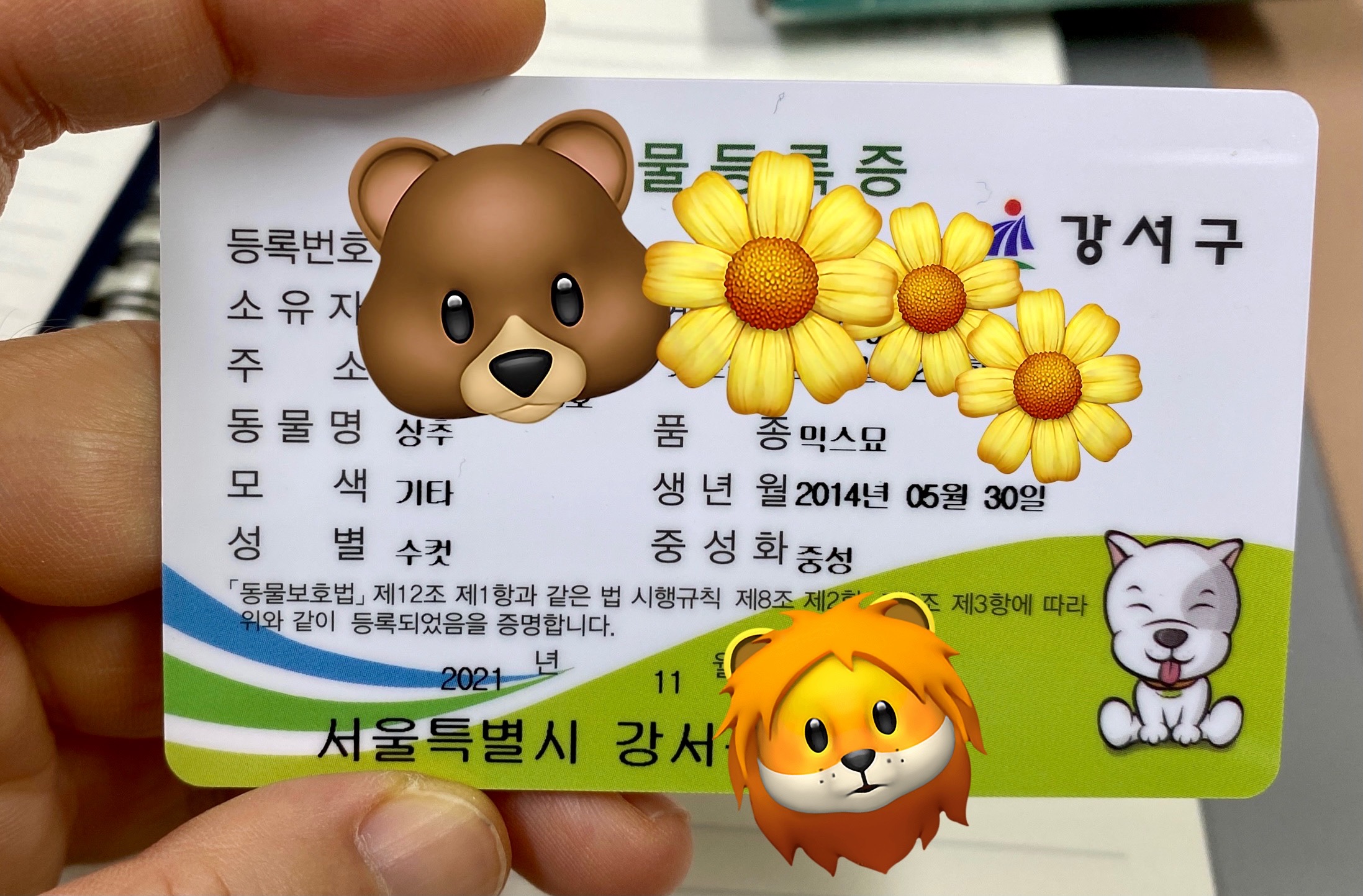 해마다 10월에 광견병이랑 종합 백신을 접종하는데, 간 김에 동물 등록도 하고 왔다.