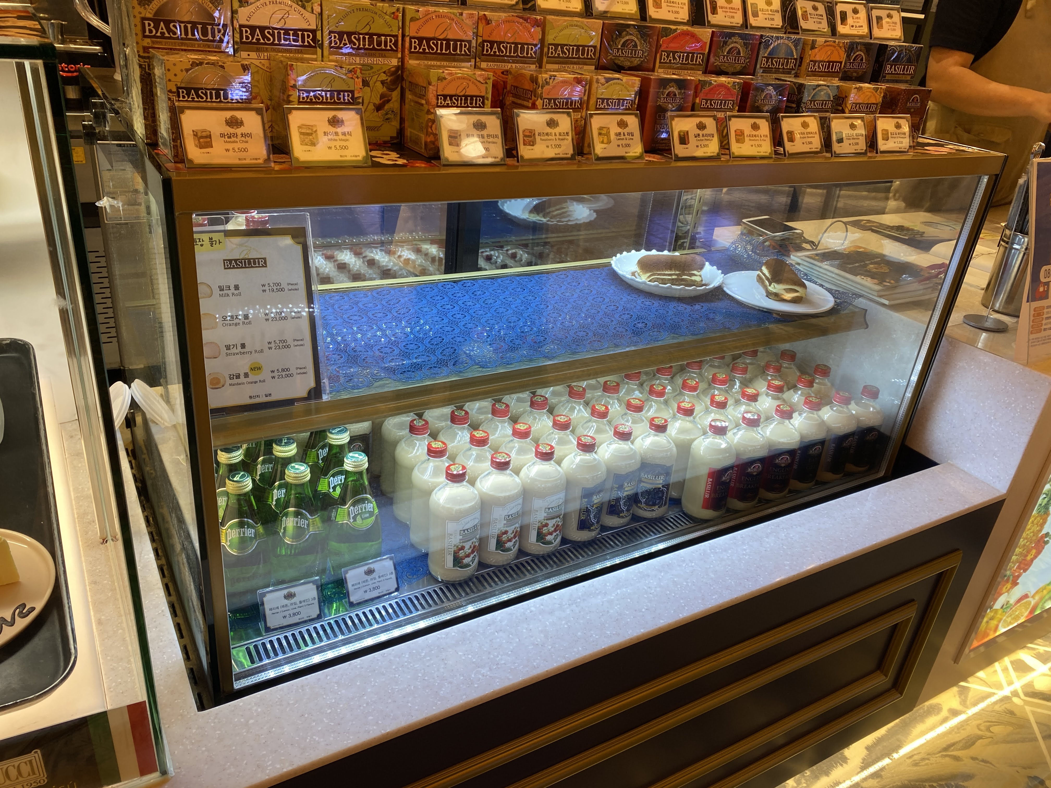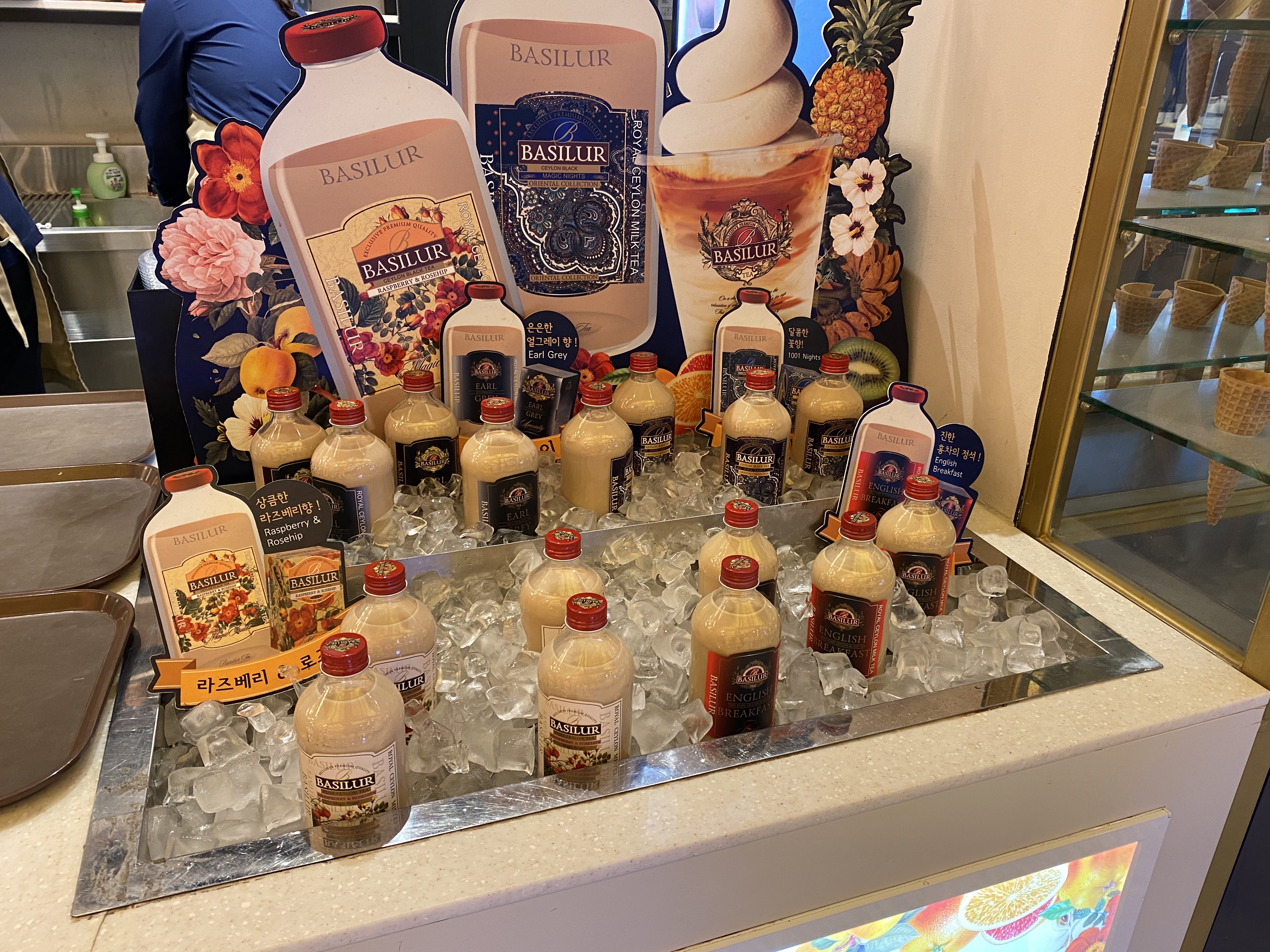 진열장을 꽉 채운 저 밀크티. 유리병에 들어서 되게 있어 보였는데 유리병에 든 건 그냥 컵에 받아먹는 것보다 가격이 비싸다. 굳이 유리병을 활용할 거 같진 않아서 그냥 넘겼지만, 저 순간에는 병으로 주문할지 말지 엄청나게 갈등했다.