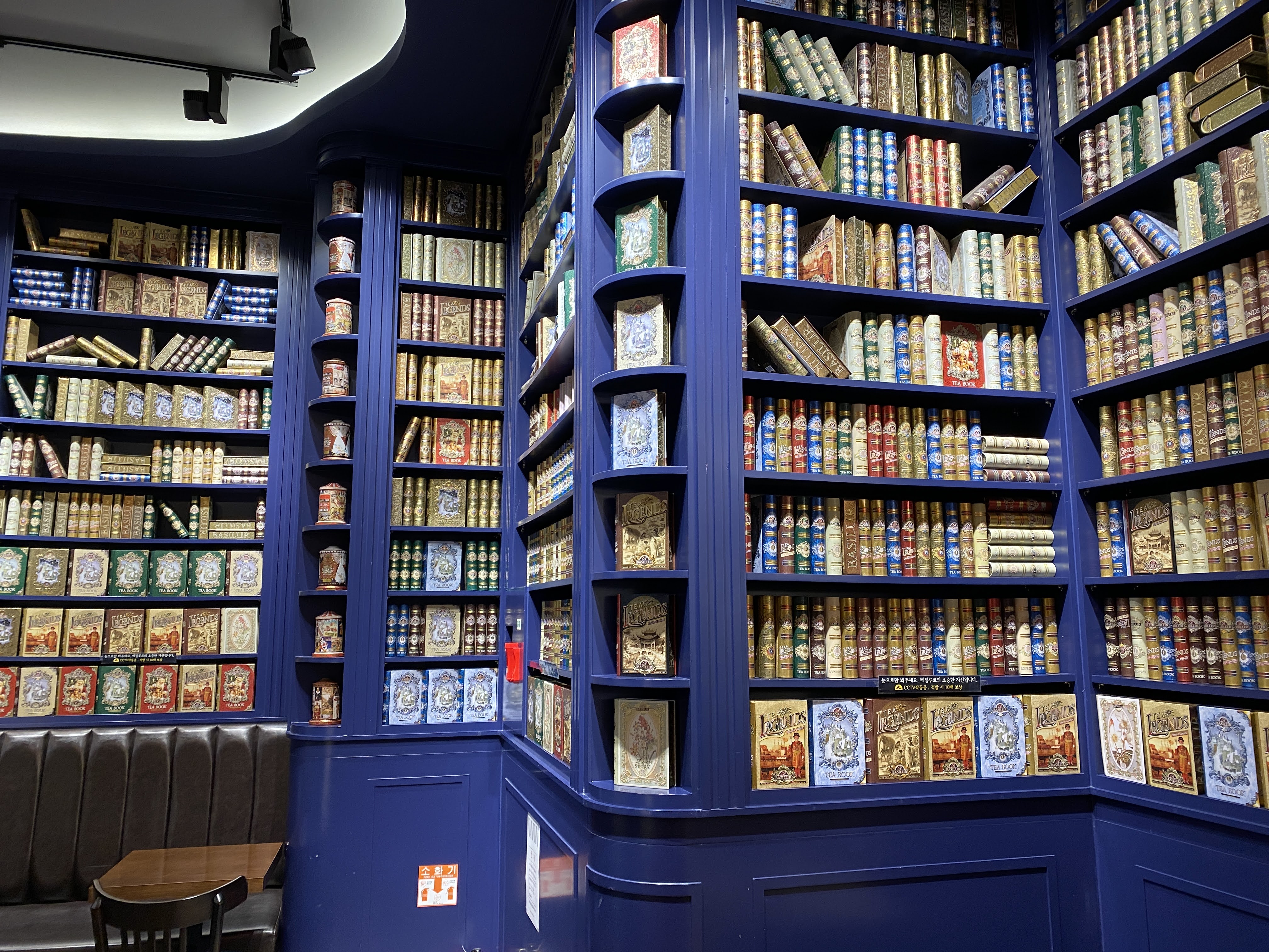 내가 앉은 곳은 이렇게 책으로 벽면을 꽉 채운 곳이었다. 고풍스럽고 고급스러운 서재에 들어온 기분이라서 기분이 무척 좋았다.
